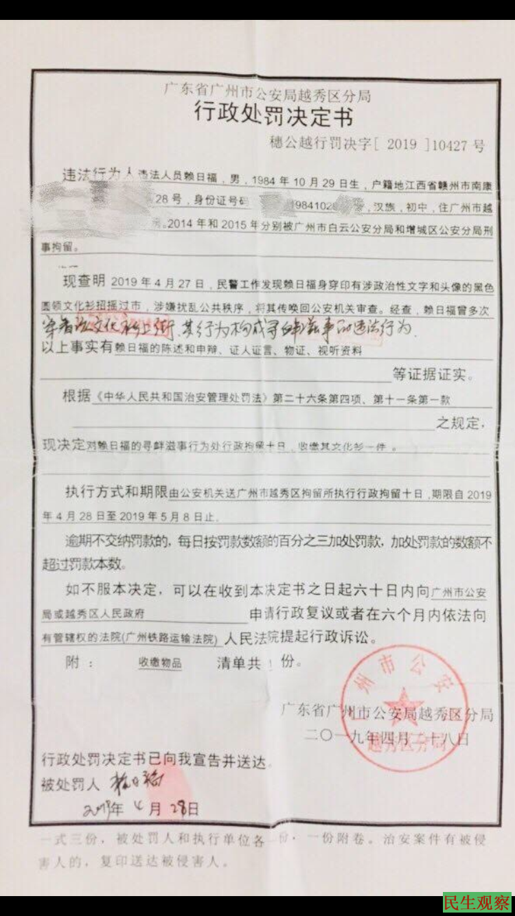 公开资料显示,赖日福于4月27日因穿着印有“公民抗命”字样以及多位人权领袖头像的黑色T恤拍照以及上传网络进行公开发布,广州越秀警方对其传唤后以“寻衅滋事罪”作出行政拘留十天的处罚,并没收涉事黑色T恤一件。