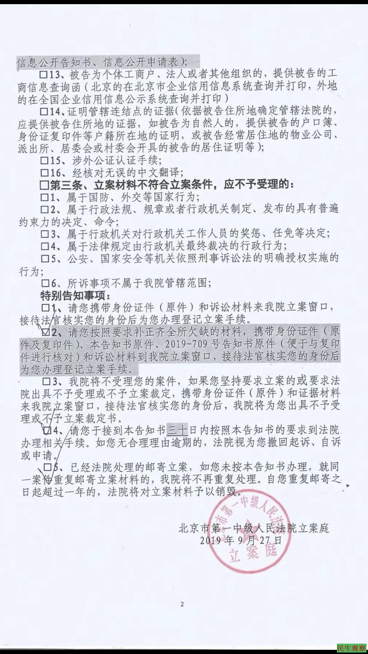 今天下午本网联系上陈明玉,她说,2019年9月5日,她向北京市第一中级人民法院邮寄了立案材料,诉自然资源部709号信息公开一案。9月27日,北京市第一中级人民法院书面给予了答复,称该院已收悉,但立案材料有欠缺,需要补正,要求她在收到书面告知书后,于30日内前往该院办理相关手续,逾期法院则视为撤回起诉。