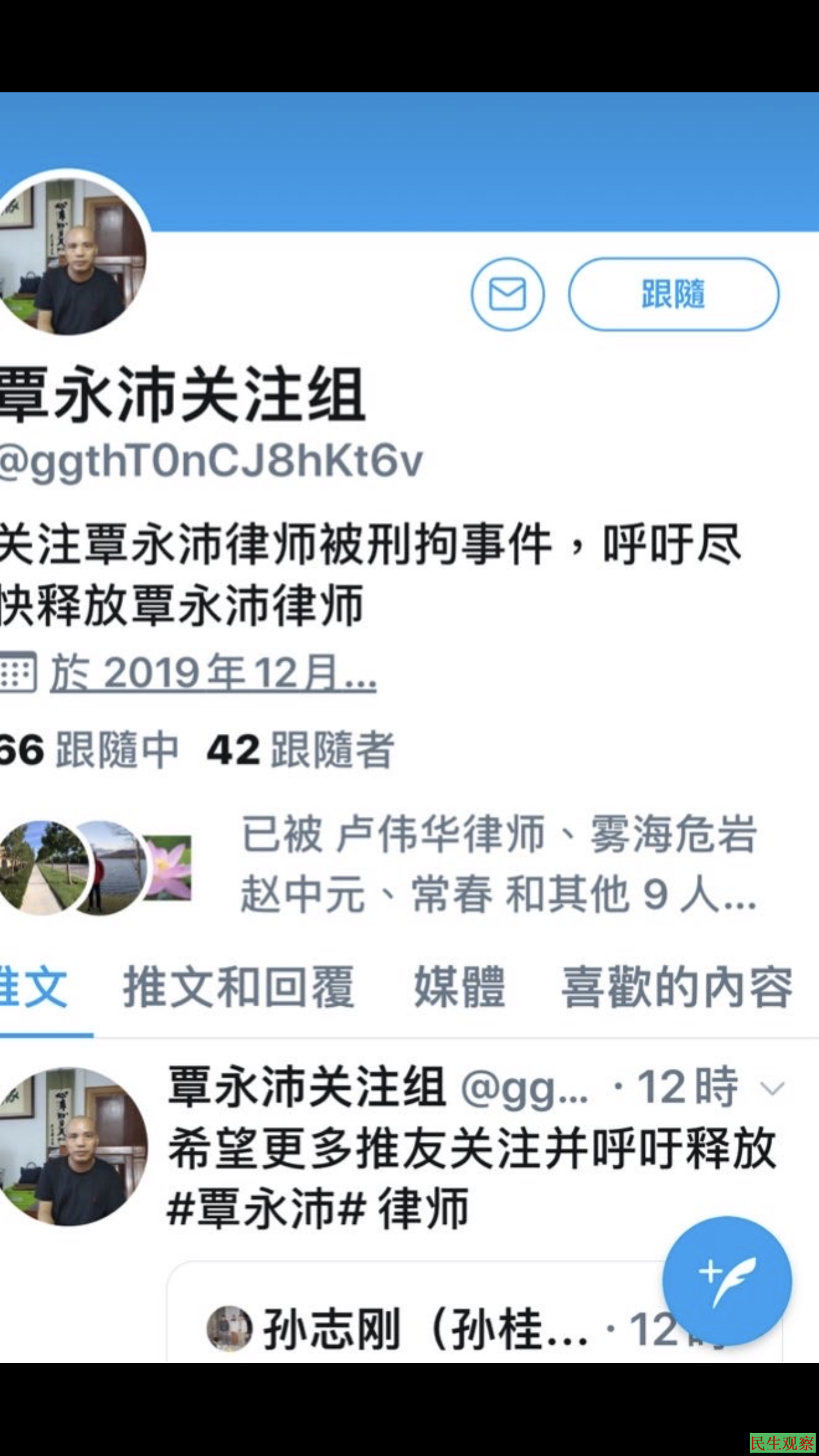 日前,海内外孙志刚、杨占青等多名朋友经协商后发起成立“覃永沛关注组”,志在关注及声援被以大罪构陷的覃永沛律师。关注组随即在推特建立独立关注账号,并在WhatsApp平台成立关注群组,以及早前建立的微信“覃永沛关注”群等多个平台进行持续关注,直到当局释放覃永沛为止。