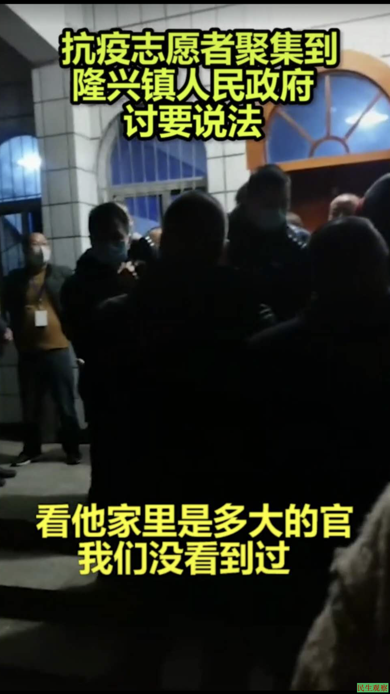 傍晚,隆兴镇的许多防疫人员与居民获知了这一消息,大家相约来到隆兴镇警局,百余群众包围了该警局,要求警方公正处理,交出辱骂、殴打了防疫人员的警员,让他公布自称“家人是大官”的官员是谁?有多大官衔?依法公布公务员信息,质问该官员是不是腐败特权官员?并且要求他向防疫人员道歉、赔偿,要求警局领导到场严查违法警察。