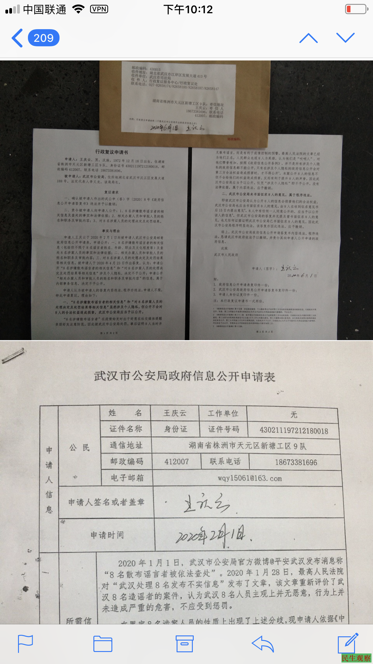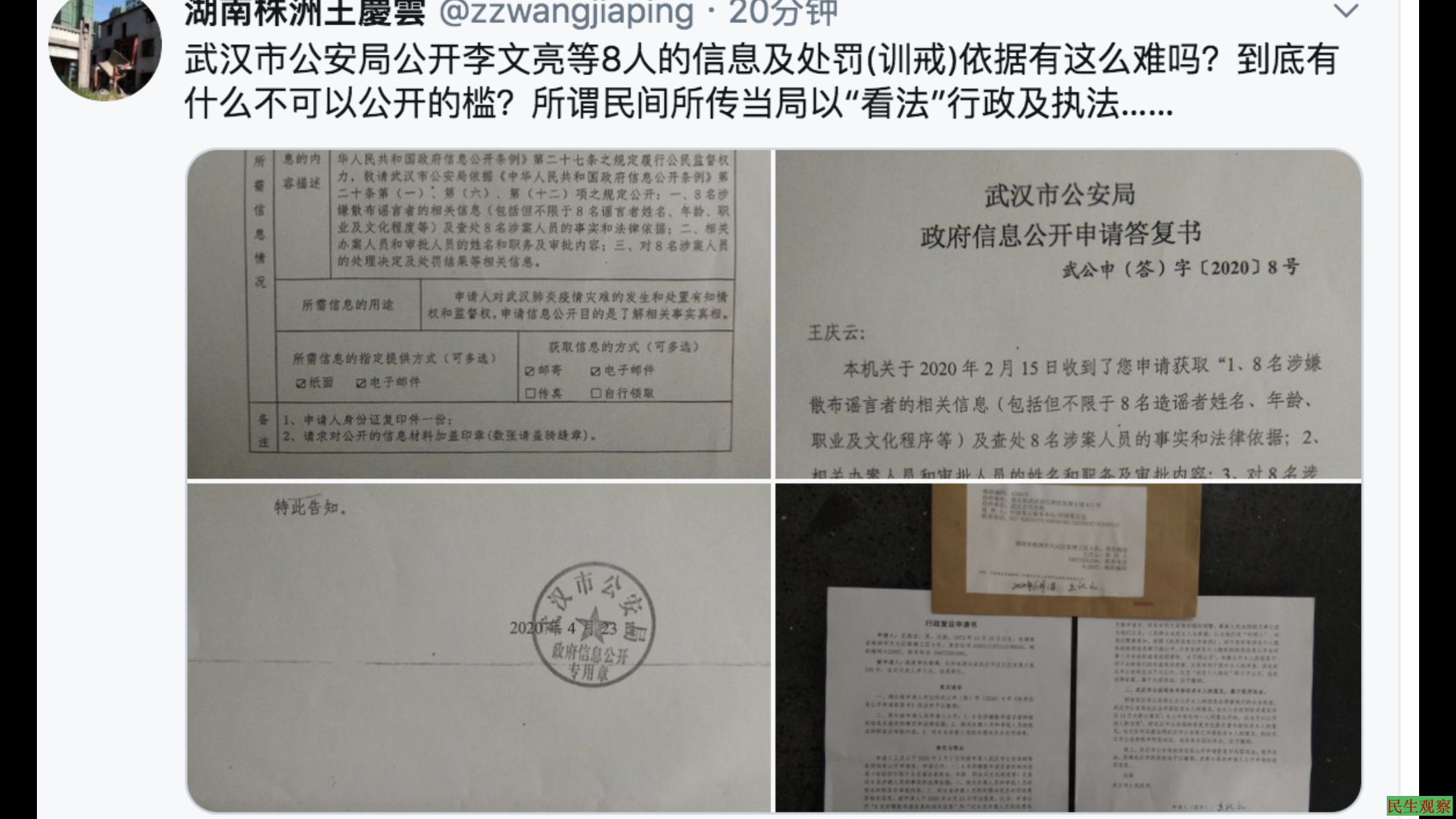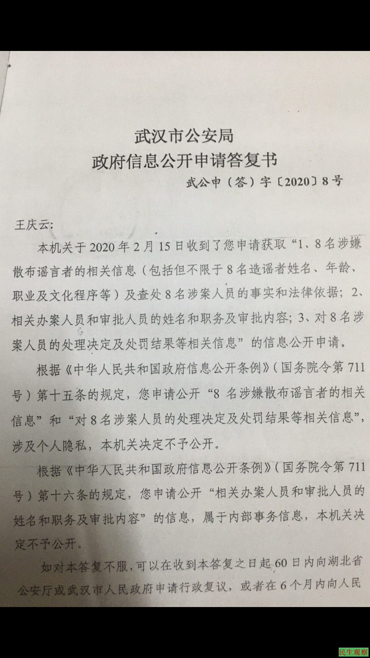 王庆云曾在李文亮事件发生后,也就是2月1日向武汉市公安局递交了信息公开申请,要求武汉市公安局依据信息公开条例公开:一、8名涉嫌散布谣言者的相关信息(包括但不限于8名谣言者姓名、年龄、职业及文化程度等)及查处8名涉案人员的事实和法律依据;二、相关办案人员和审批人员的姓名和职务及审批内容;三、对8名涉案人员的处理决定及处罚结果等相关信息。(见附件2)
