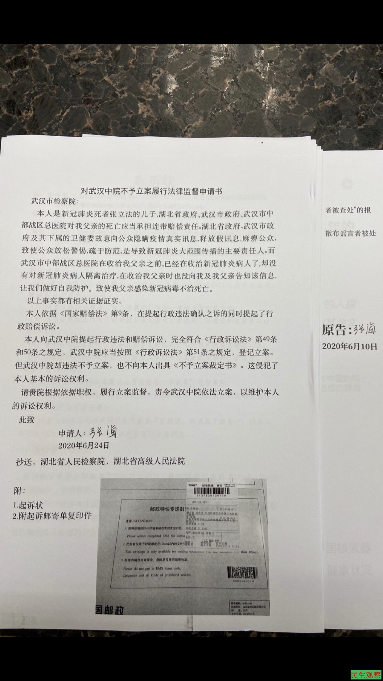 【民生观察2020年6月24日消息】今天临近中午12点时,中国新冠索赔第一案的原告张海将三份《对武汉中院不予立案履行法律监督申请书》(以下简称“《监督申请书》”)通过邮政快递分别邮寄至武汉市检察院、湖北省检察院和湖北省高级人民法院。