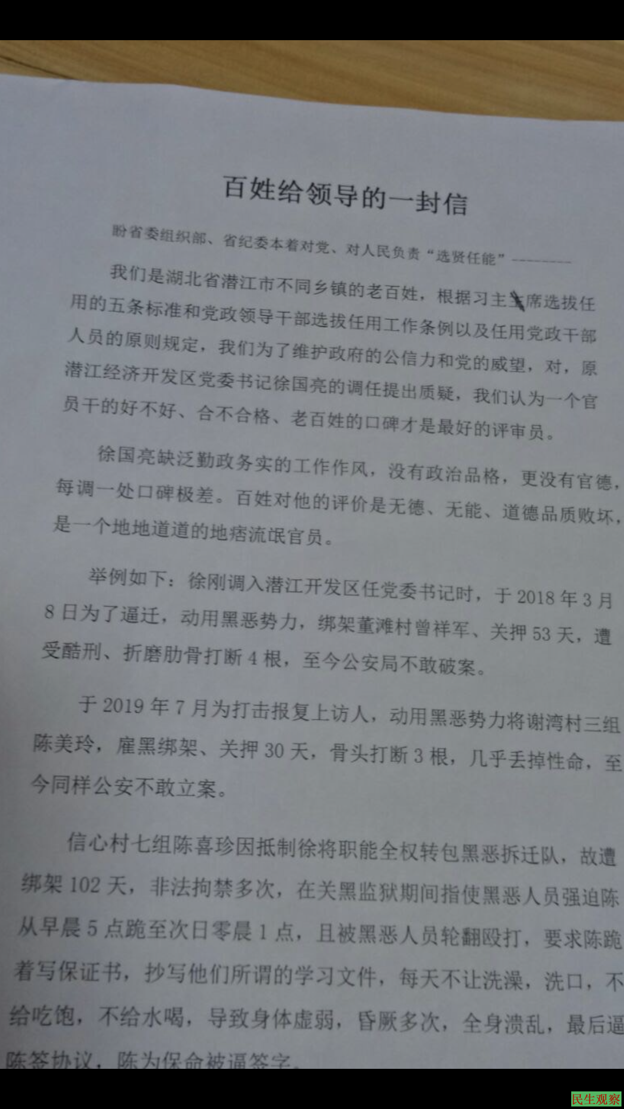 潜江访民姜尚芝,被逼签字遭到强拆,姜尚芝丈夫被徐国亮雇请的黑社会殴打头破血流不止住院了10多天,徐国亮为了政绩,为了达到强拆的目的随后雇佣的黑恶势力人员将姜尚芝非法绑架关押65天,在关押期间与陈喜珍一样遭到残酷的酷刑虐待,姜尚芝被酷刑虐待的生不如死的情况下割腕自杀,因为发现及时才没丢性命,姜尚芝家人弟弟因不服黑恶强拆被逼跳河,在三九寒天的情况下,徐国亮指挥黑恶人员几十人将家人弟弟围堵在河中不让上岸,这不是简单的逼迫强拆的问题而是有指挥有安排的刑事犯罪的行为,因为有权就任性,天高皇帝远,此地由我管。这就是基础干部的本质与无道德底线的问题。