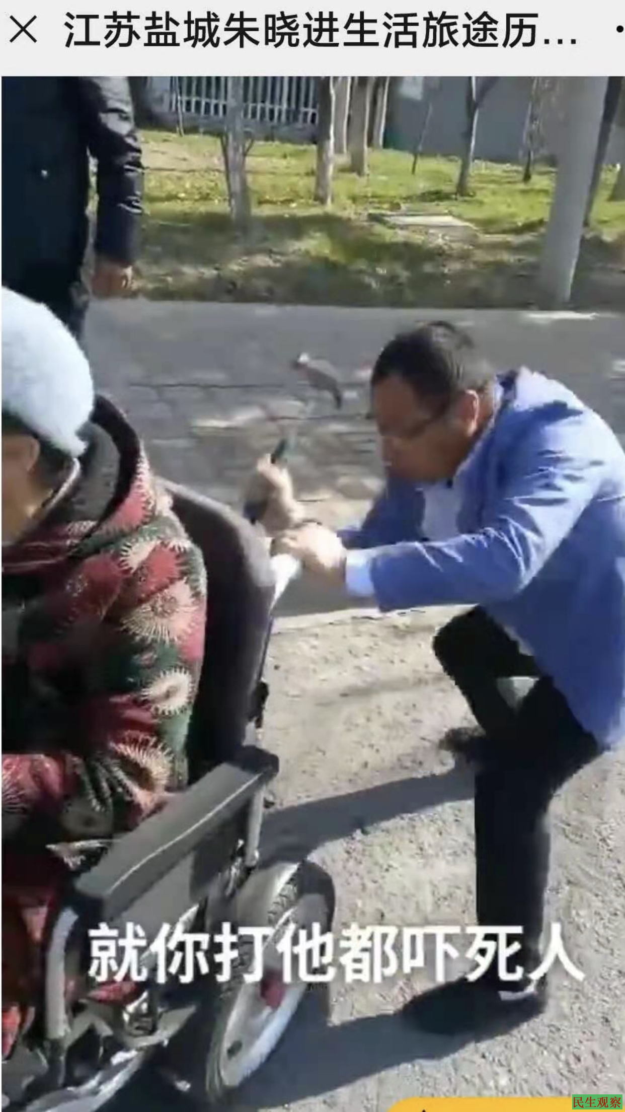 【民生观察2021年1月1日消息】12月30日,江苏盐城访民朱晓进(女)发求救信称:江苏盐城市大丰区村民朱晓进,因8年前拒绝村霸逼签空白拆迁协议书,惨遭暴打导致终身瘫痪。2020年6月28日,朱晓进坐着轮椅到大丰区大中街道办事处找席书记投诉,被村官拦截并且扯光衣服。2020年12月30日,朱晓进再次坐着轮椅去上级投诉,却被村领导指使维稳人员拦截,该维稳人员不但非法拦截朱出行,还凶恶的辱骂推搡朱晓进,推搡之后更是掏出了一把铁锤,对着朱晓进坐着的残疾人轮椅车一顿狂砸,直至把电瓶托架砸断,拉出电瓶后将之打砸报废,最后导致朱晓进无法出行。