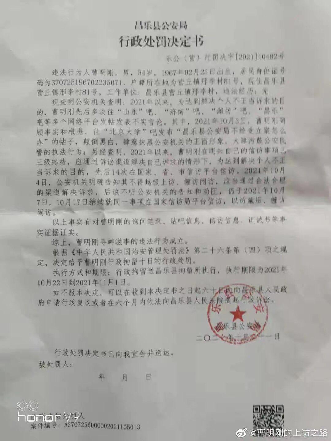 曹明刚称:“由于从2021年6月6日开始至今人身自由被限制,所以我只能在网上举报信访,连续网上举报过几次后,我于2021年10月22日被行政拘留10日,理由是‘寻衅滋事’。”