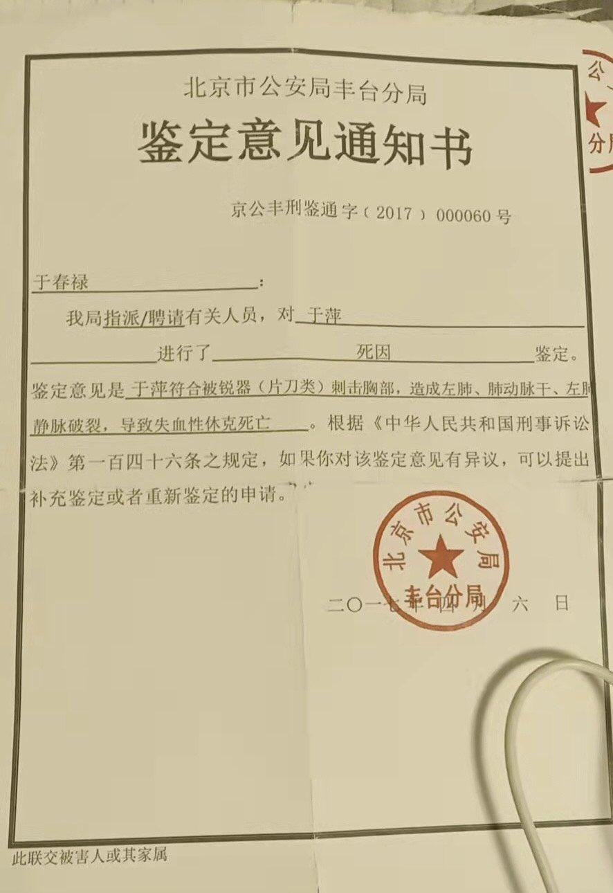 之后,北京市公安局丰台分局出具《京公丰刑鉴通字【2017】000060号》鉴定意见通知书,于萍符合被锐器(刀片类)刺击胸部,造成左肺、肺动脉干、左肺静脉破裂,导致失血性休克死亡,北京市公安局以故意杀人罪报批北京市人民检察院第二分院,检察院也以故意杀人罪于2017年4月27日正式批捕,但是在2017年6月19号北京市人民检察院第二分院,却撤销了对杀人犯杜申雨的批捕。