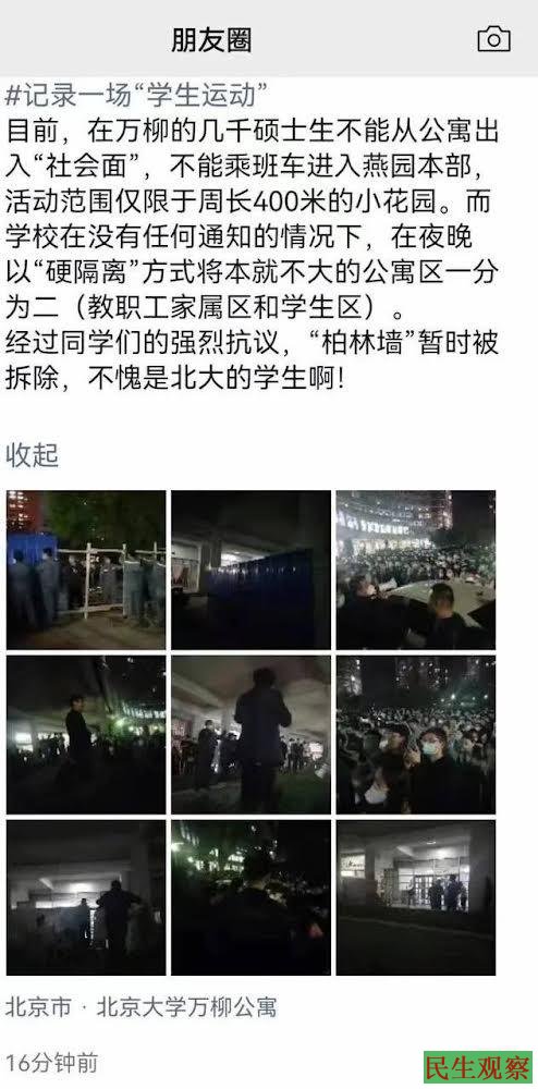 【民生观察2022年5月17日消息】2022年5月15日夜晚,北京大学万柳校区领导在没有任何通知的情况下,以“硬隔离”的方式将本就不大的公寓区一分为二,教职工家属区和学生区,该举动导致校区的几千硕士生不能从公寓出入“社会面”,不能乘班车进入燕园本部,活动范围仅限于周长400米的小花园,经过同学们的强烈抗议,隔离墙暂时被拆除,据称有同学代表已与校方达成了几点基本诉求。