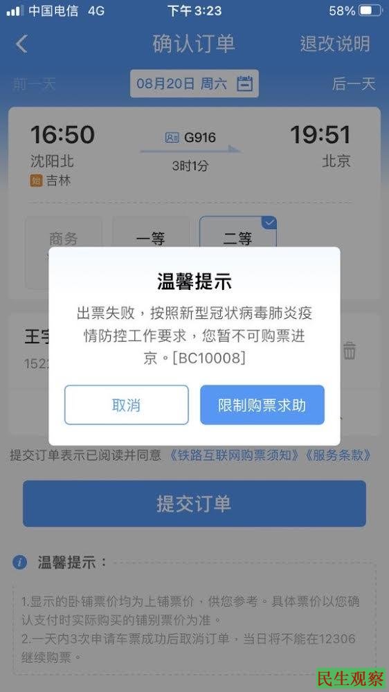 五原告因北京健康宝弹窗无法购票到北京,弹窗状态显示为“③”,要求原告暂缓进京。