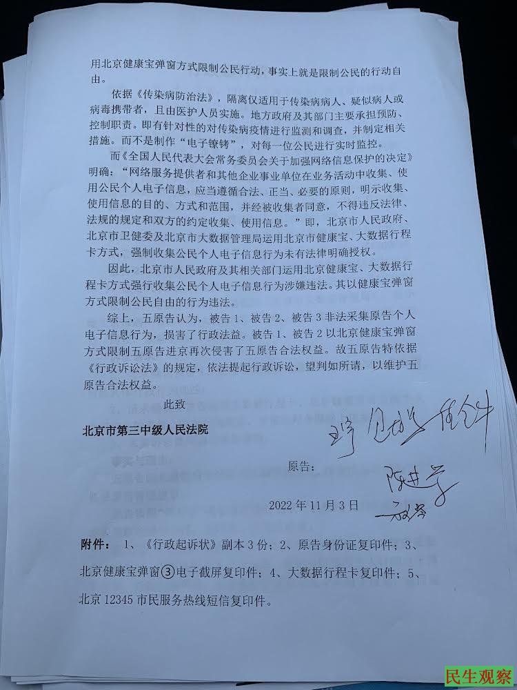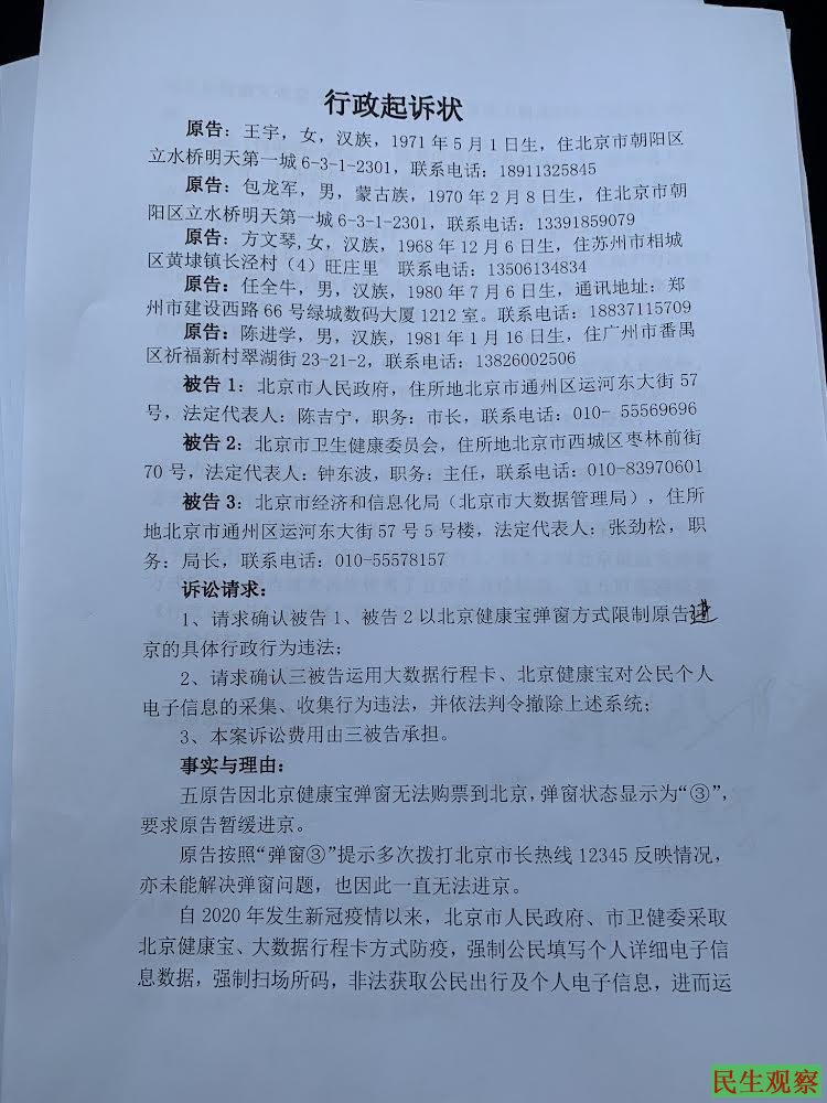 【民生观察2022年11月3日消息】王宇律师因北京健康宝弹窗已流浪76天无法回家,有朋友也因弹窗无法进京。11月3日,王宇、包龙军、任全牛、陈进学、方文琴五位原告已向北京三中院邮寄起诉状,起诉北京市政府、北京市卫健委、北京市大数据管理局运用大数据、健康宝对公民个人电子信息的采集、收集行为违法。五被告表示,希望北京市法院依法立案审理,有受健康宝弹窗之苦的朋友可以加入他们的原告行列!