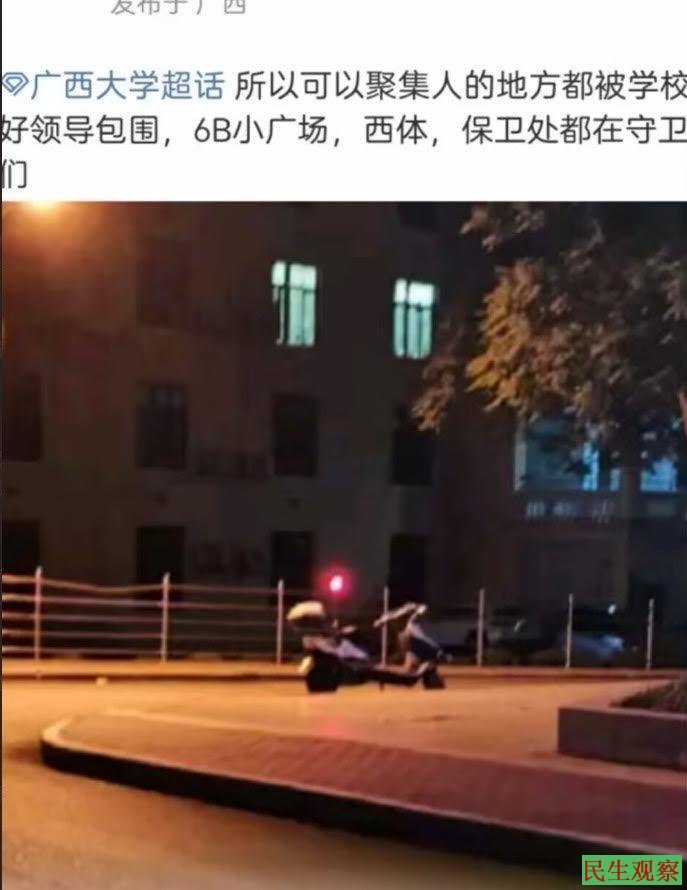 12月12日晚,广西大学提前破获了一起学生抗议活动。起因是广西大学已经阳了几十个,但是一直没有放开,甚至正常考试。12日下午五点左右,有人在微博广西大学超话上提议晚上七点一起去西体。随后有辅导员进入聊天群,导致群解散,同时广西大学超话被禁止发言。有人发帖称,校园内所有聚集的地方都被安保包围。有网友投稿称,尽管学生并没有聚集,但是校门外还是已经聚集了大量警车。据悉,最后的解决方案是,修改了隔离区的名字。