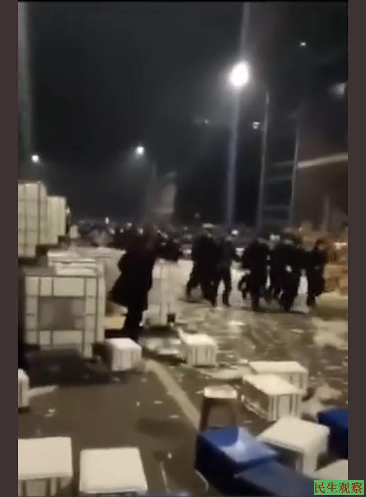 目前抗议仍在继续。视频显示,防爆警察进场,抗议工人向工厂大门进发,向警方投掷塑料盒。