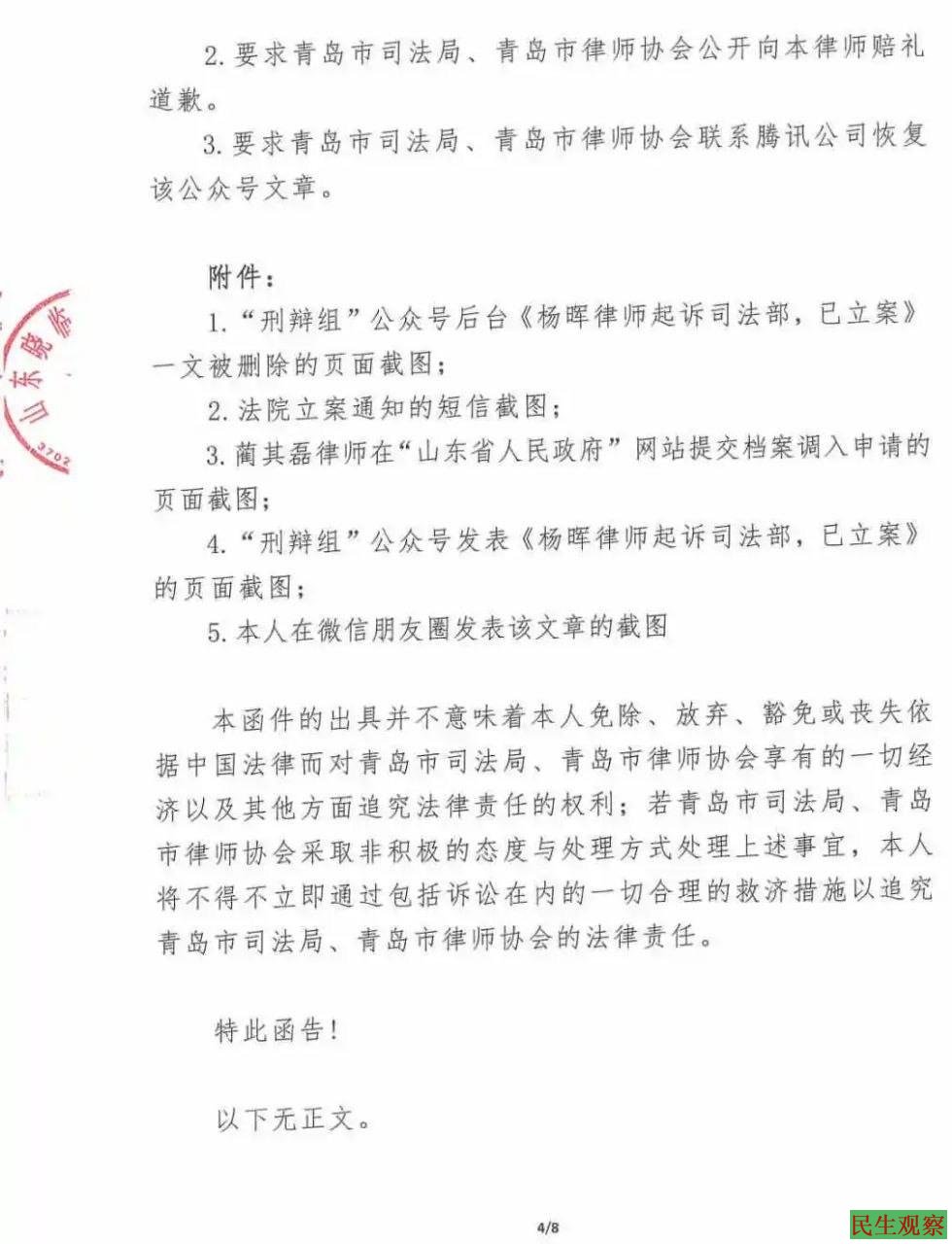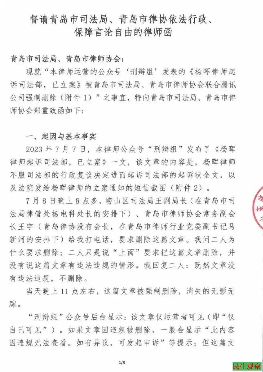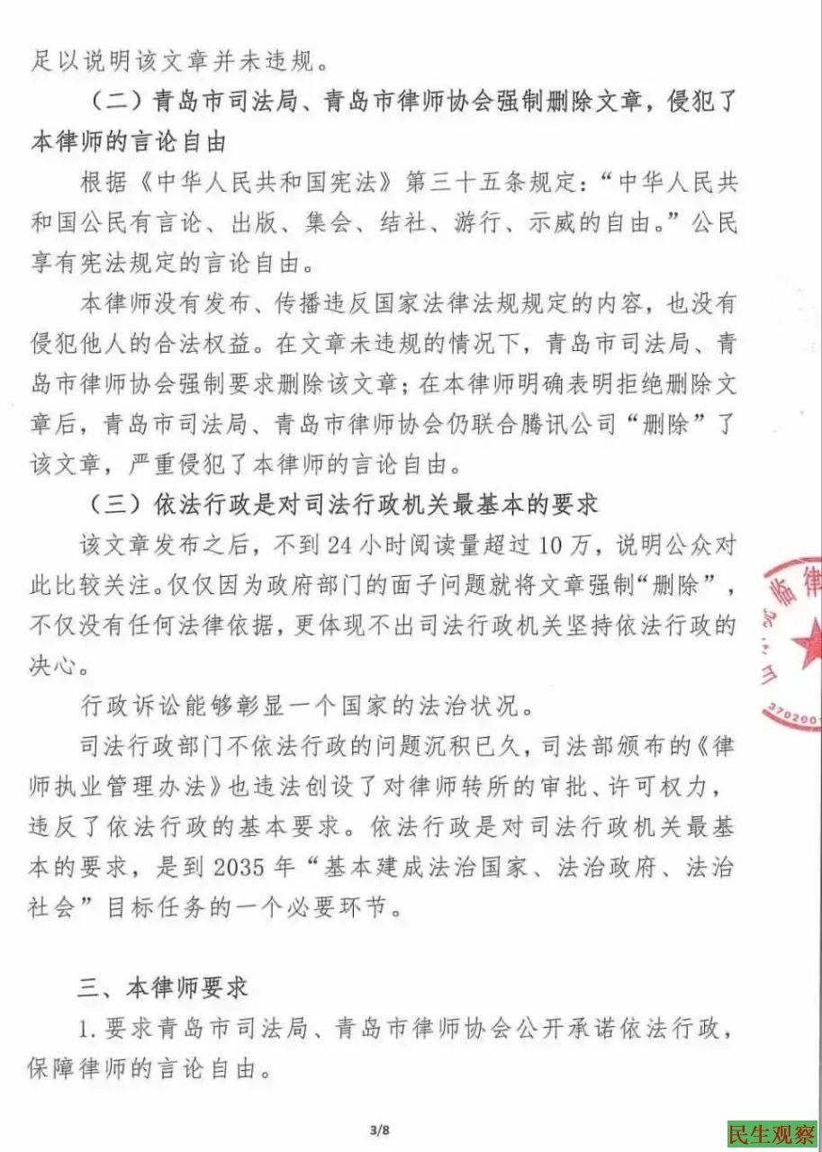 【民生观察2023年7月11日消息】2023年7月9日,山东青岛的于凯律师,因文章被青岛司法局和律协联合腾讯公司删掉,现发律师函给司法局和律协,要求恢复该公众号文章,保障自己的言论自由。