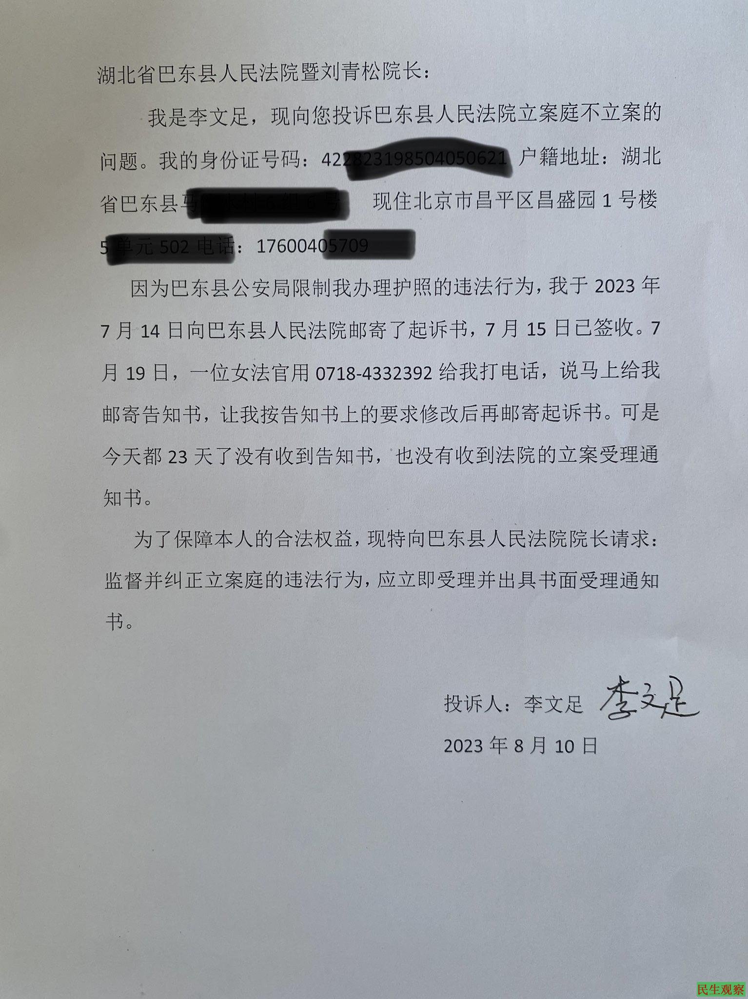 【民生观察2023年8月12日消息】湖北省巴东县公民李文足,因被巴东县公安局限制办理护照,就其违法行为,李文足向巴东县人民法院邮寄了起诉书,但至今未收到法院告知书或立案受理通知书。近日,李文足给巴东县人民法院院长写去投诉信,请求监督并纠正立案庭的违法行为,应立即受理并出具书面受理通知书。