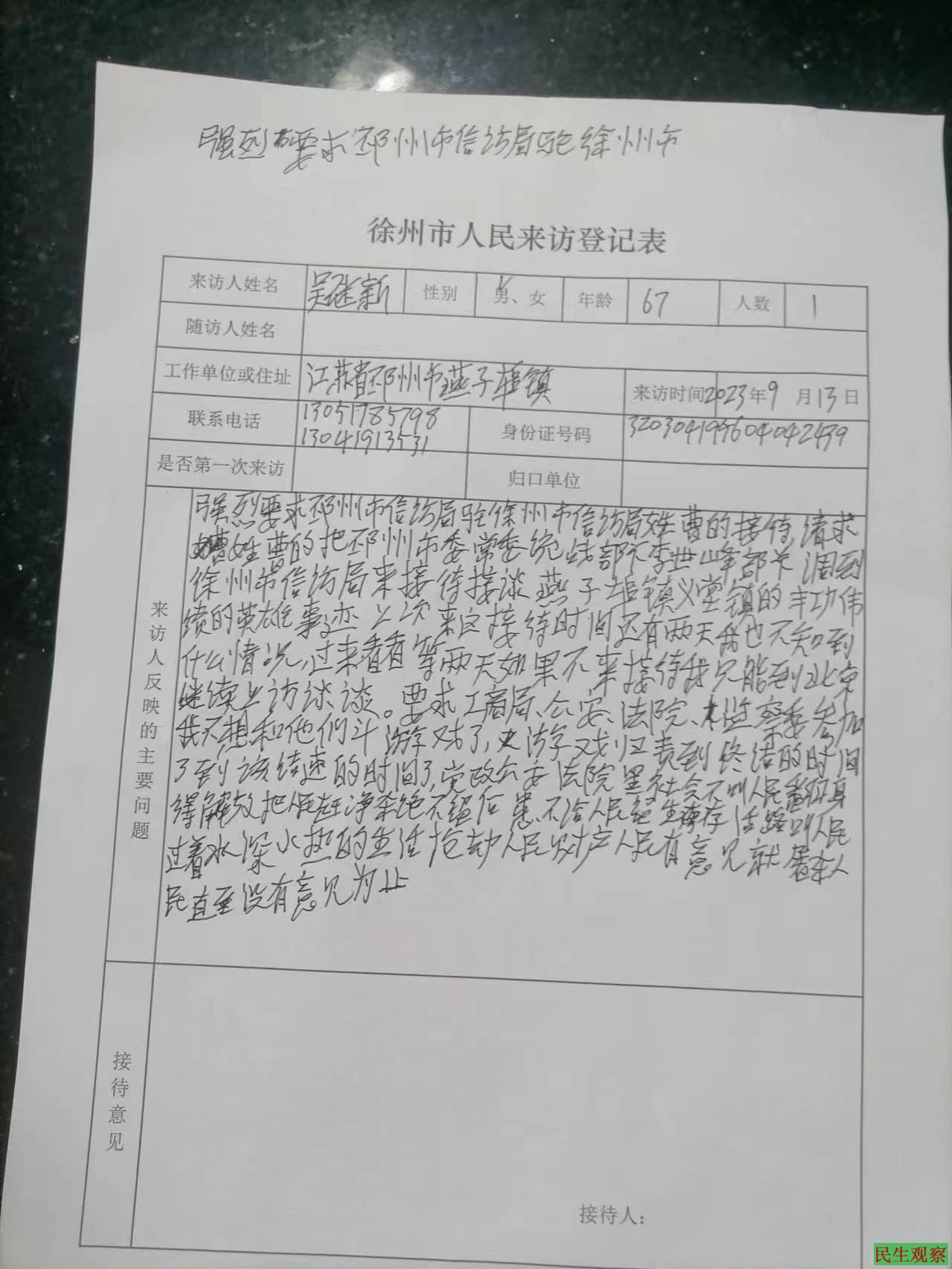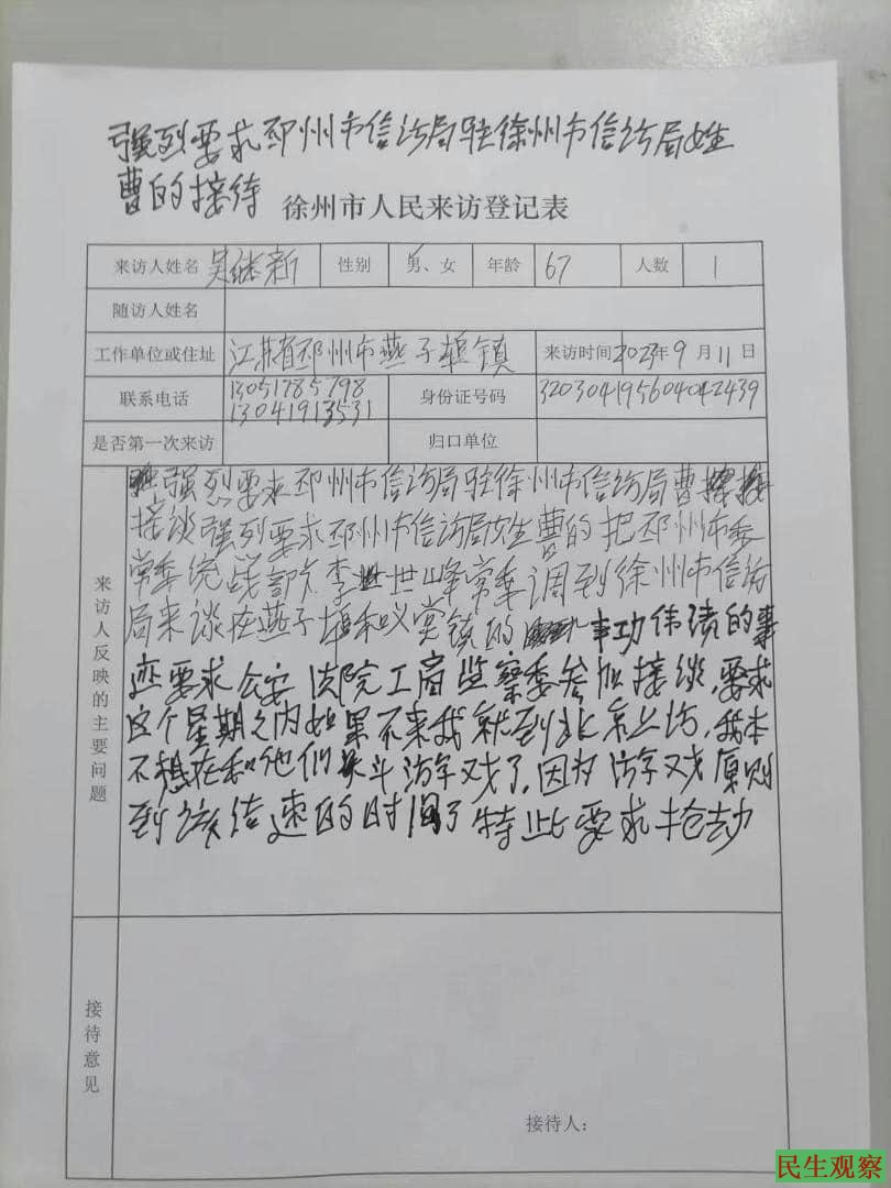 回来后吴继新9月11日再次到江苏省邳州市在徐州市信访局上访,强烈要求邳州市信访局驻徐州市信访局姓曹的,把邳州市委常委统战部长李世峰部长(市常委)调到徐州市信访局接待,李世峰部长(市常委)在燕子埠镇和义堂镇是授予有丰功伟绩表彰的优秀干部,吴继新强烈要求公安、法院、工商局、监察委参加。强烈要求本星期内给予答复意见,要求在徐州市信访局接待,吴继新说:徐州不想解决问题,就到北京上访寻求高层解决问题,吴继新说:他不想在同当的政府玩游戏了,游戏原则到该结束的时间了,江苏邳州市与徐州市一直都在踢皮球忽悠吴继新。