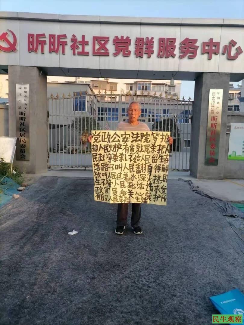 【民生观察2023年9月15日消息】江苏邳州市维权人士吴继新因合同纠纷一案,自建厂房所有设备被政府侵占维权近20年无果,多次被抓铺刑事拘留遭到两次构陷判刑,劳教一次,无数次从北京被抓铺遣返回当地关押。吴继新9月5日再次从北京被遣返回当地江苏徐州,回来后问题任然没有得到解决,吴继新去信访局也没有人接待,无奈之下吴继新举牌维权抗议不公,他在本管辖社区门口举牌“党政公安,法院等抢夺人民财产,有意就屠杀把人民赶净杀绝不给人民留生存活路不叫人民翻身得解放,叫人民过着水深火热生活不管人民的死活,请求党政官员多关心爱护所有的人民幸福生活”,吴继新在路边永远跟党走的宣传牌前举牌“强烈要求邳州市公开李世锋常委在燕子埄镇义掌镇的丰功伟绩,抢劫和其它履历”。