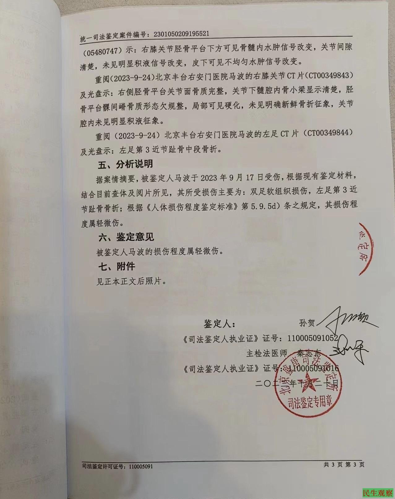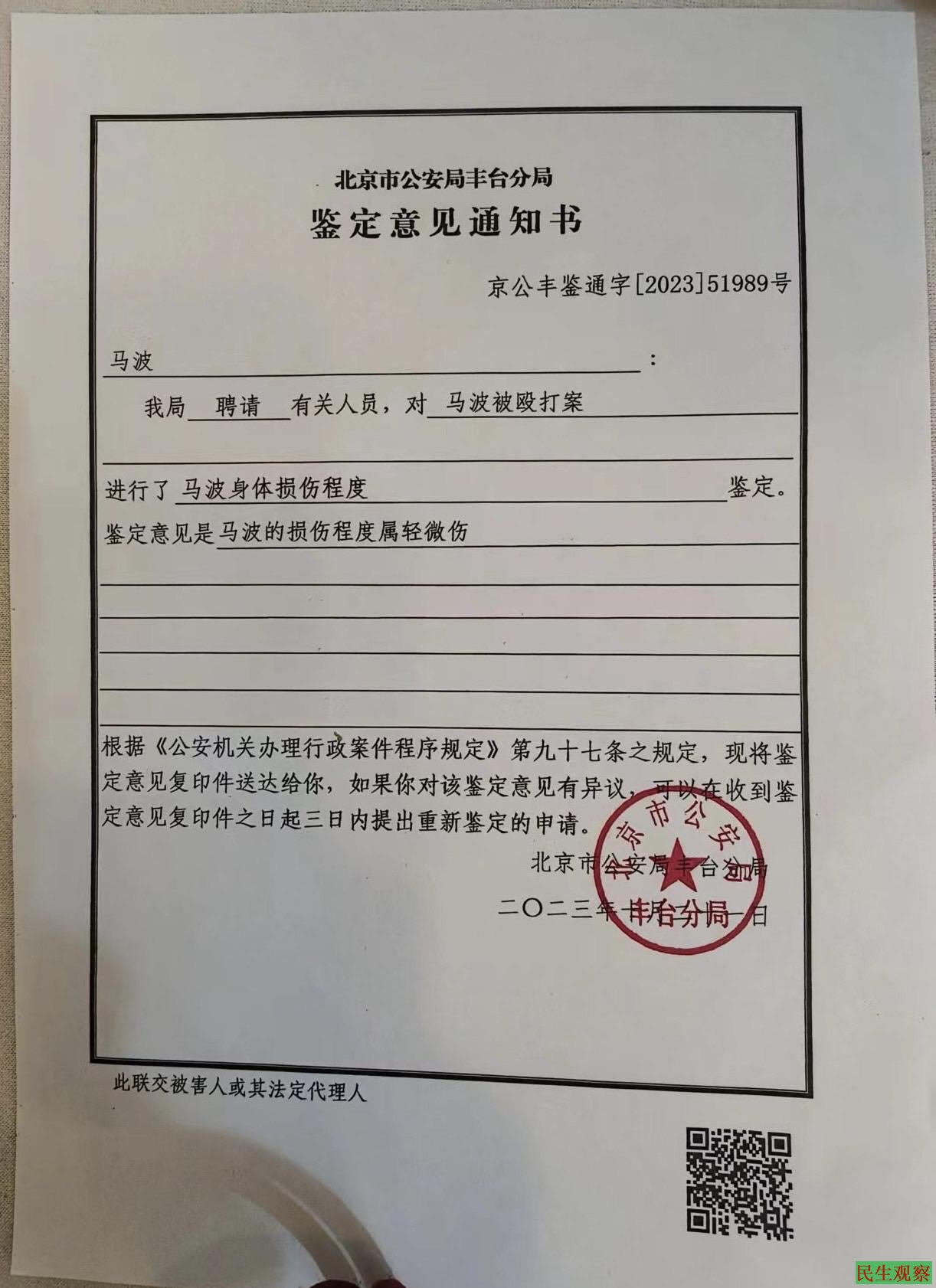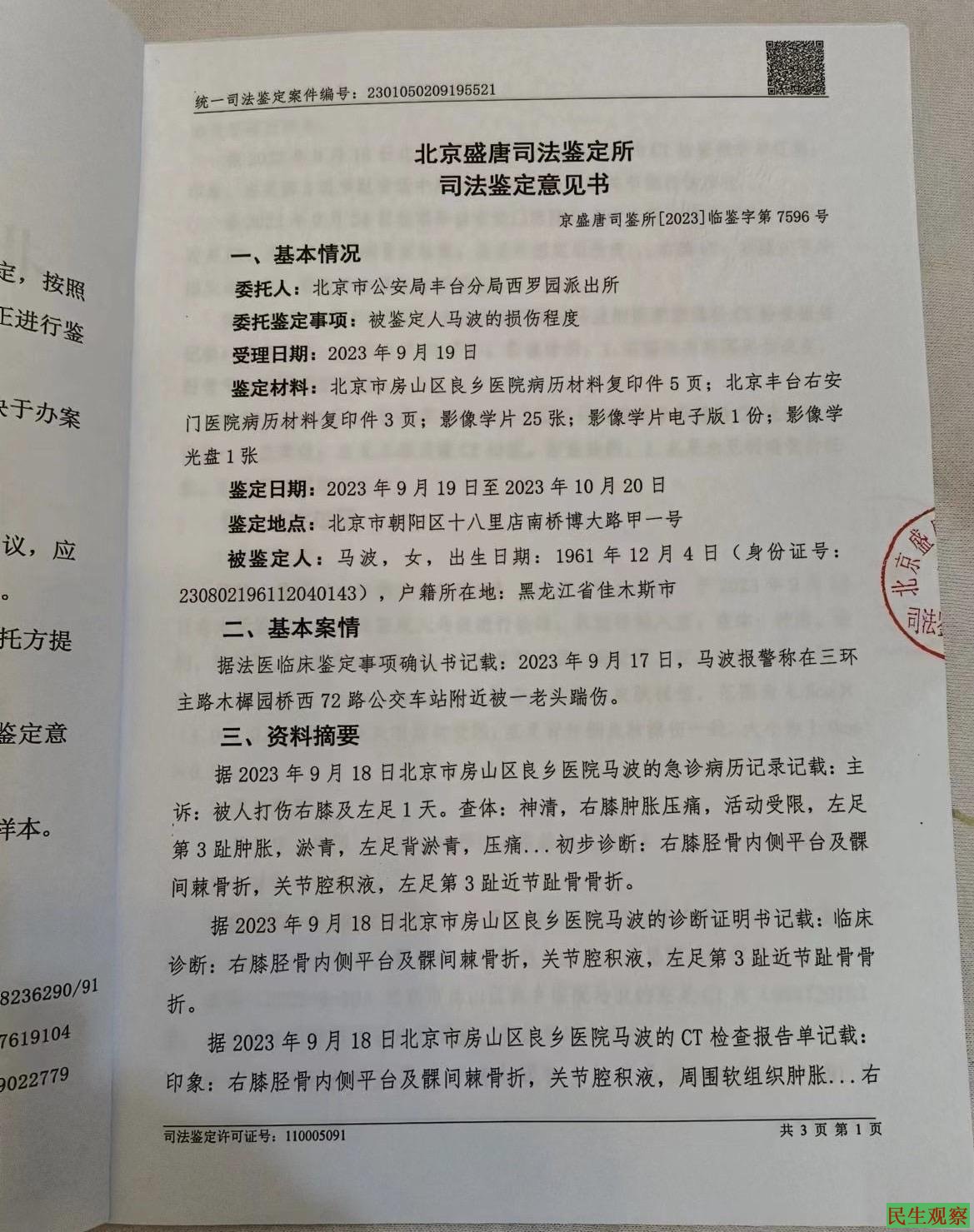 【民生观察2023年10月26日消息】黑龙江维权访民马波因在北京被无故打伤,造成双腿多处骨折。经北京市公安局丰台分局西罗园派出所委托北京盛唐司法鉴定所对马波的损伤程度进行鉴定,现鉴定结果显示属轻微伤。对此鉴定结果马波不认可,依法提出申请,要求对其损伤程度进行重新鉴定。