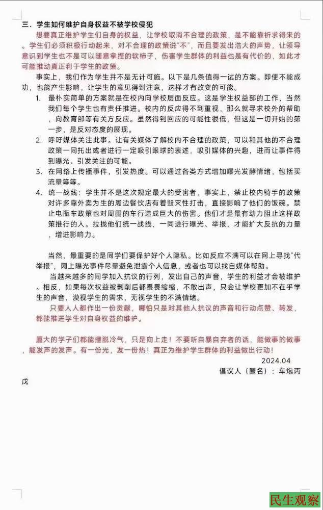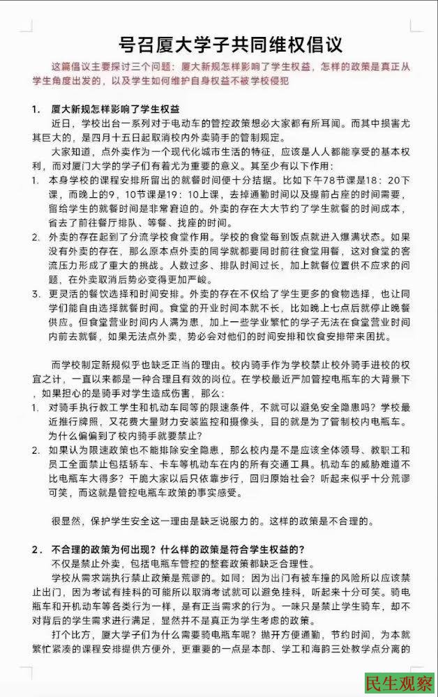 【民生观察2024年4月13日消息】2024年4月10日,厦门大学出台了关于禁止外卖骑手进入校园及校内电动车管制等举措。为反对该举措,4月11日,厦门大学学生在网上发出维权倡议,号召全校共同维护学生利益。文中表示,想要真正维护学生们的利益,让学校取消不合理的政策,是不能靠祈求得来的,学生们必须积极行动起来,对不合理政策说“不”,让领导们意识到伤害学生群体的利益也是有代价的,如此才有可能推动真正利于学生的政策。只要人人都作出一份贡献,哪怕只是对其他人抗议的声音和行动点赞,转发,都能推进学生对自身权益的维护。