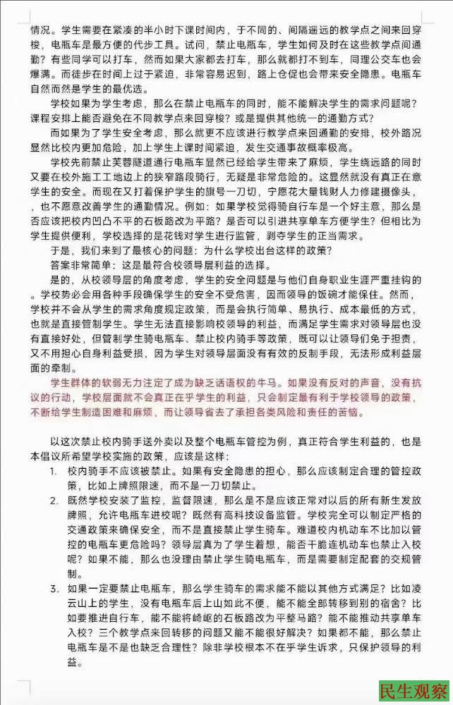 3.如果一定要禁止电瓶车,那么学生骑车的需求能不能以其他方式满足?比如凌云山上的学生,没有电瓶车后上山如此不便,能不能全部转移到别的宿舍?比如要推进自行车,能不能将峙岖的石板路改为平整马路?能不能推动共享单车入校?三个教学点来回转移的问题又能不能很好解决?如果都不能,那么禁止电瓶车是不是也缺乏合理性?除非学校根本不在乎学生诉求,只保护领导的利益。