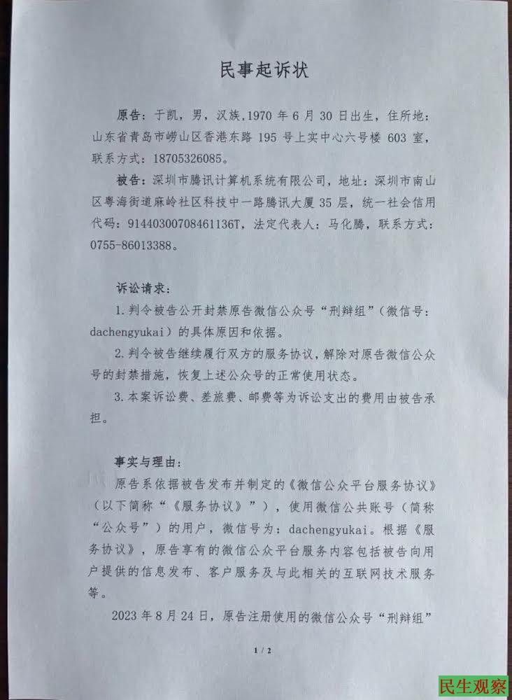 【民生观察2024年5月5日消息】近日,山东晓临律师事务所主任于凯律师到腾讯公司送锦旗抗封号。此前,于凯律师一个视频号、三个公众号先后被腾讯公司永久封禁,致信腾讯总部无果;后于凯律师将腾讯告上法庭,并于今年3月提交了网上诉讼,但南山法院既不立案又不出具书面裁定书,彻底摆烂。于是,于凯律师只好亲自来到深圳腾讯总部送旌旗抗议封号。