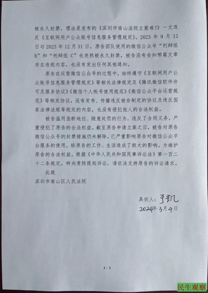 2023年8月24日,原告注册使用的微信公众号“刑辩组”被永久封禁,理由是发布的《深圳市南山法院立案难!》一文违反《互联网用户公众账号信息服务管理规定》。