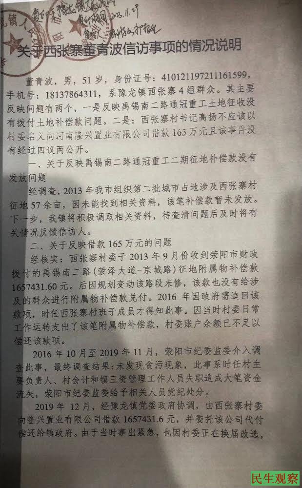 二是西张塞村书记高扬不应该以村委名义,向河南隆兴置业有限公司借款165万元,且该事件没有经过四议两公开。