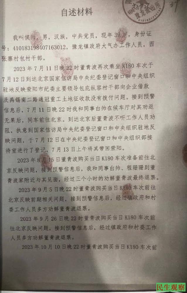 2023年11月28日晚22时董青波购买当日K180车次前北京反映前期相关问题,于29日早上6时许到达北京西,被豫龙镇驻京值班人员劝返,镇工作人员何晓辉一并乘车将其送回荥阳。当日8时白帅和同事宇飞,派出所民警姚银玲、郭根生驱车前往接应,在河北省邢台市京港澳高速出口南出站口接到董青波后于下午4时许带回荣阳。