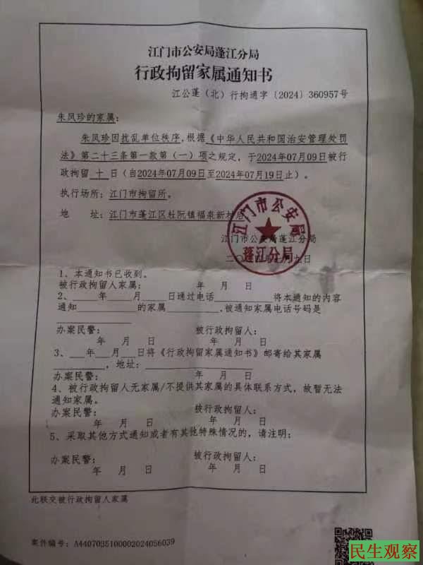 因上访维权,2024年7月9日,朱凤珍被江门警方以扰乱单位秩序为由,处于行政拘留10天。2024年7月19日期满获释。