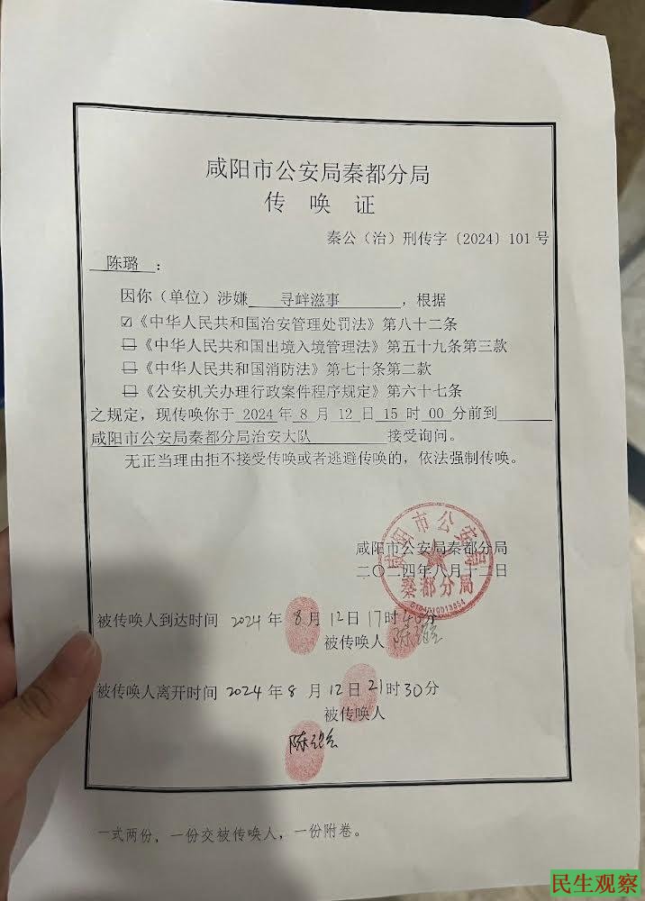 2024年8月12日,陈璐因在网上持续为父亲喊冤,被咸阳市公安局秦都分局以涉嫌寻衅滋事为由传唤。