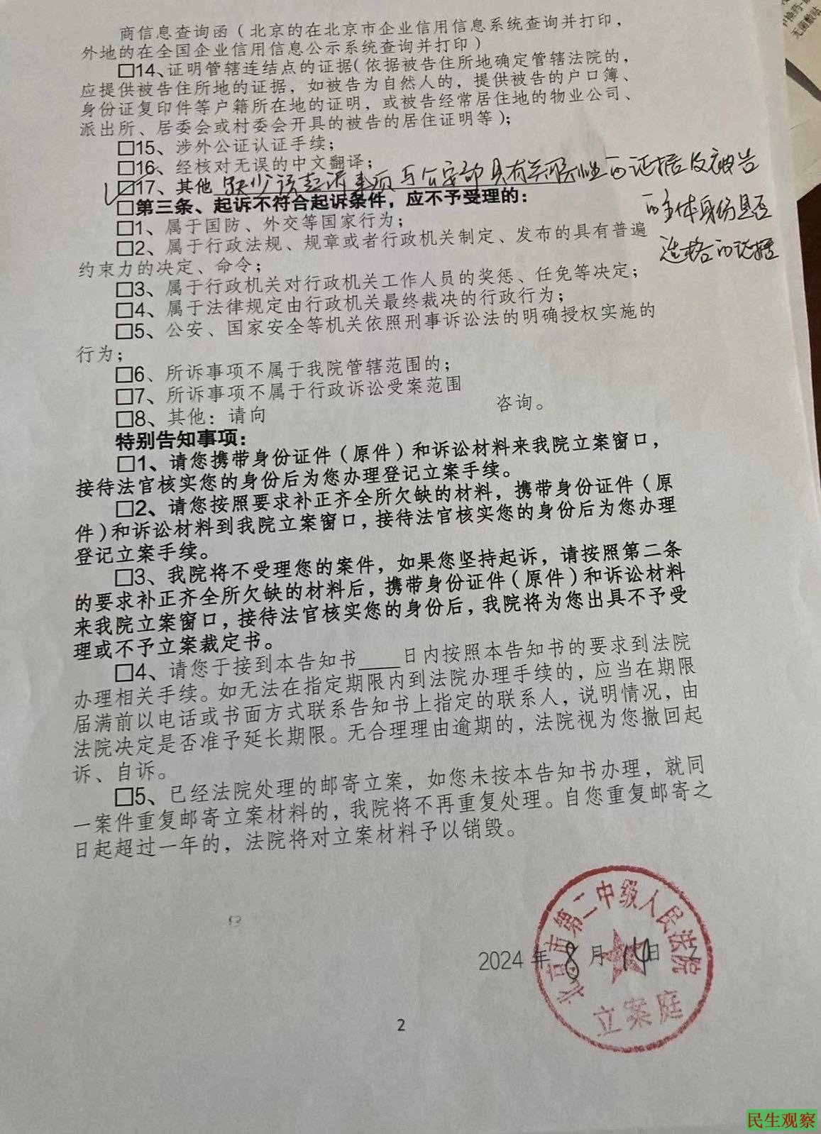 【民生观察2024年8月19日消息】日前,山东潍坊公民傅文先生因网络身份认证问题,起诉中华人民共和国公安部。近日,傅文的代理律师收到了北京市第二中级人民法院邮寄的立案告知书,对案件拒绝立案,同时要求原告傅文补正相关证据。