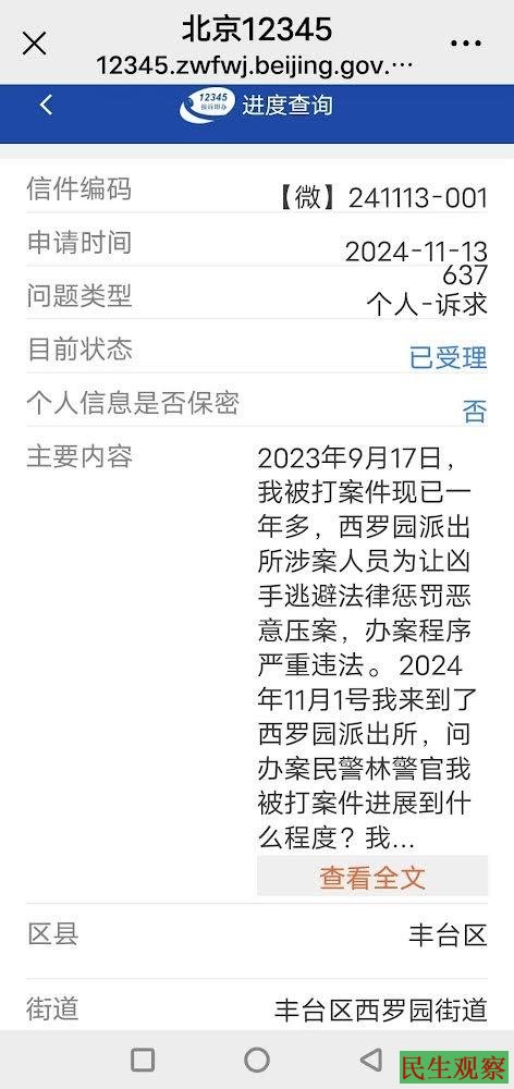 【民生观察2024年11月15日消息】近日,黑龙江维权访民马波就自己在京期间被打一案,向北京12345市长热线投诉西罗园派出所办案程序严重违法。当日中午时分,马波接到西罗园派出所的电话回复,但依然是敷衍搪塞。