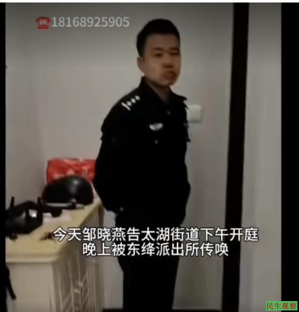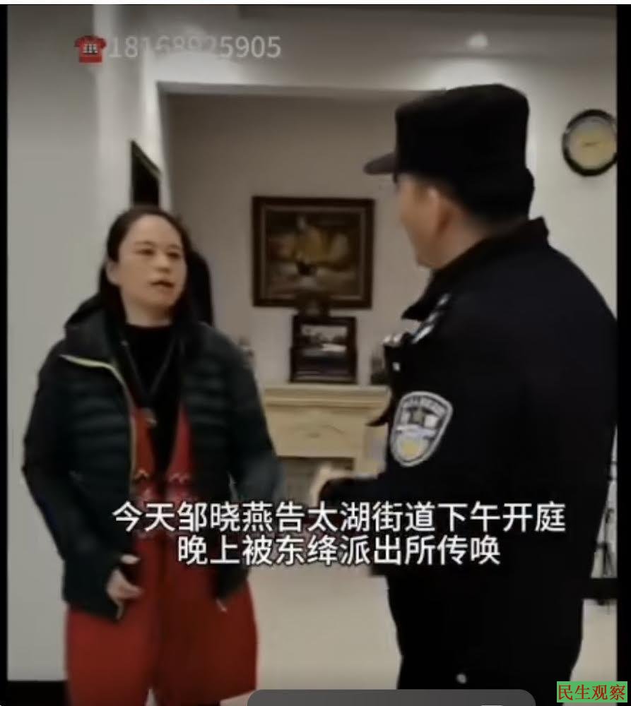 【民生观察2024年11月29日消息】近日,江苏省无锡市经开区太湖街道访民邹晓燕,因对太湖街道发起控告,之后被东绛派出所警察上门以寻衅滋事为由带走传唤。邹晓燕于今日下午时分获释回家。