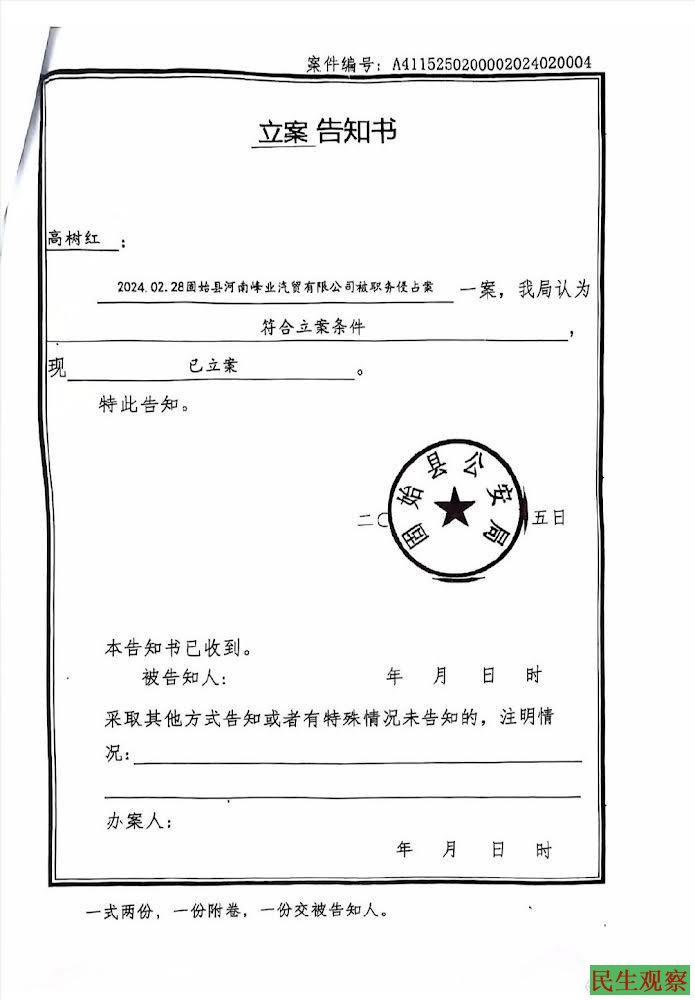 在该案办理过程中,黄宗平、丁蕊等人送达给被害人高树红的《立案告知书》的立案日期竟然被遮挡,明显是为了掩盖刑事立案时间晚于关联民事案件的事实。