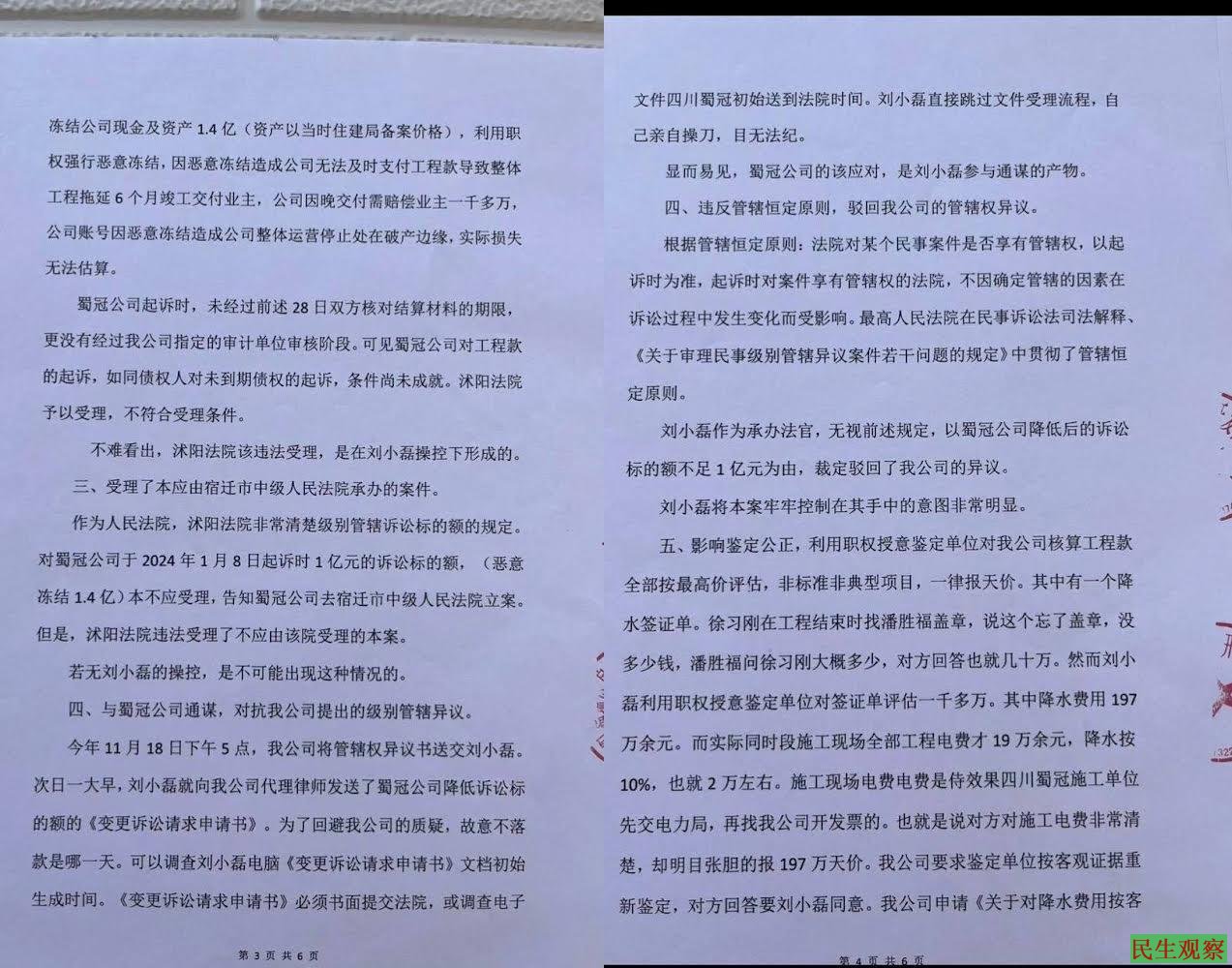 2025年1月22日,沭阳福瑞达房地产开发有限公司(以下简称福瑞达公司)发布悬赏公告称,由于沭阳县人民法院刘小磊法官,在办理四川蜀冠建筑有限公司(以下简称蜀冠公司)诉沭阳福瑞达房地产开发有限公司建设工程施工合同纠纷案件中,沭阳县人民法院经济开发区法庭法官刘小磊枉法办案,帮其舅舅四川蜀冠公司恶意冻结福瑞达公司现金及资产1.4亿,恶意冻结造成该公司整体运营停止,其行为同时严重违反了国家公职人员的行为规范。