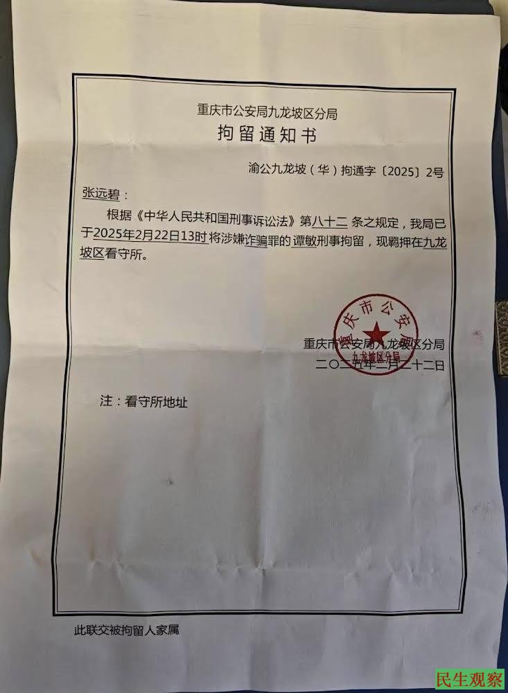据知情人士称,谭敏欲前往北京上访,在半路上被拦截强行带回重庆,随即被以涉嫌诈骗罪刑拘。目前,家属正在联系律师介入,并前往看守所了解详细情况。