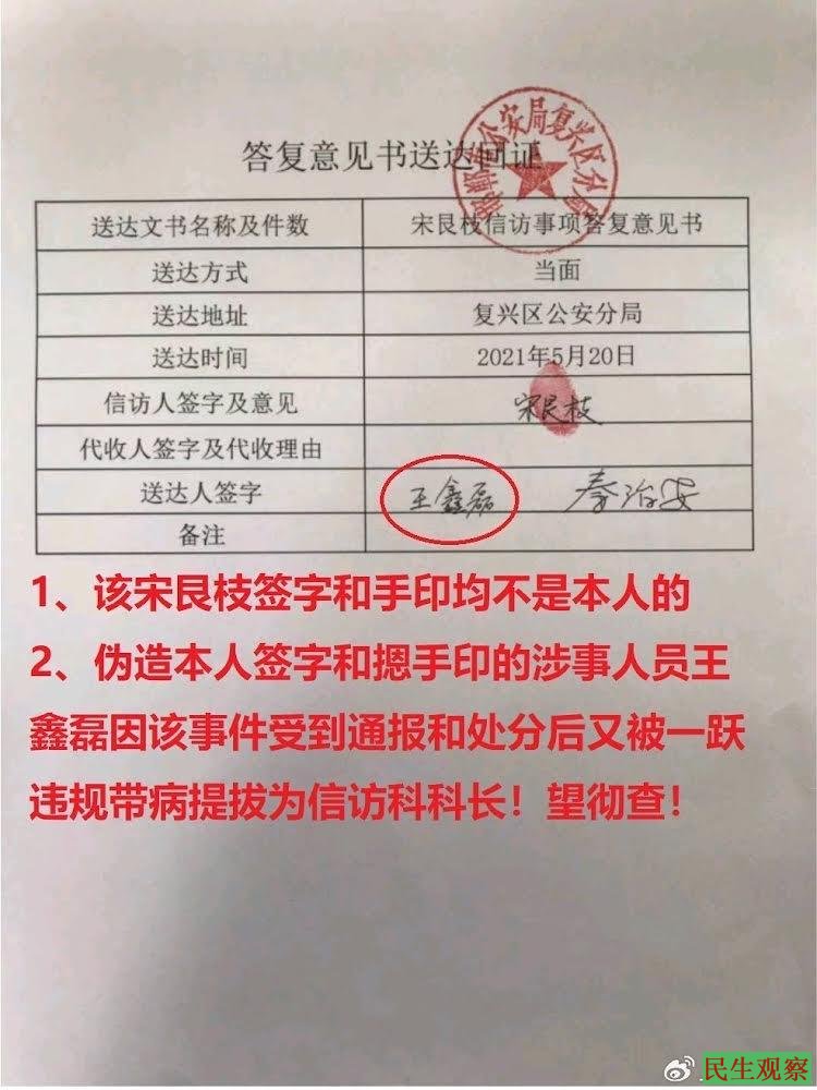 另外,宋艮枝要检举控告邯郸市复兴区公安分局伪造虚假证据以及当事人的签字和手印。更狼狈的是,该伪造当事人签字和摁手印的涉事人员王鑫磊(警号022190)因该事件受到相关纪委通报和处理后又被违规带病提拔,由普通辅警一跃成为了公安分局信访科科长!(有截图为证)。为此,受害人宋艮枝提出第二项请求,请纪检监察机关予以调查核实,依规依纪依法严肃处理!