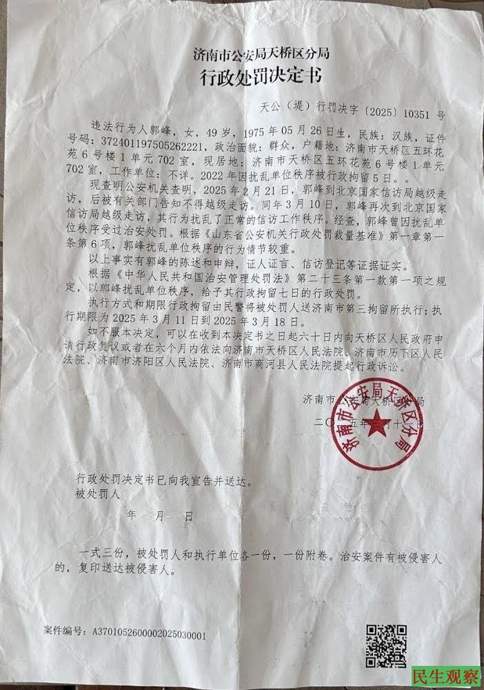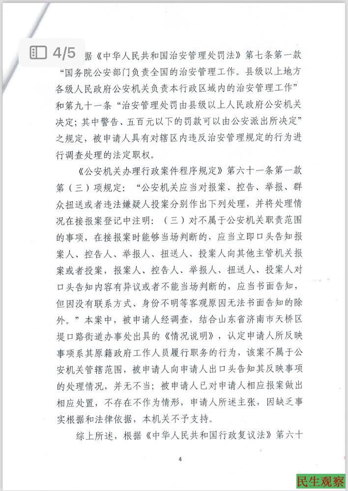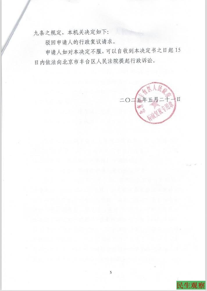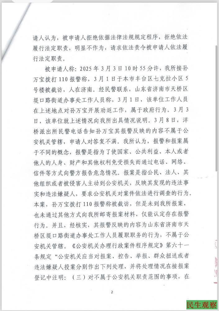 【民生观察2025年5月31日消息】山东省济南市维权人士孙万宝,因为小区物业公用部分被非法占用、要求罢免非法业委会以及维修资金被贪腐等事由上访,遭济南市天桥区政府雇佣人员非法截访和打伤,报案后无人受理,孙万宝提出行政复议申请,近日案件结果出来,却遭到推诿和踢皮球。