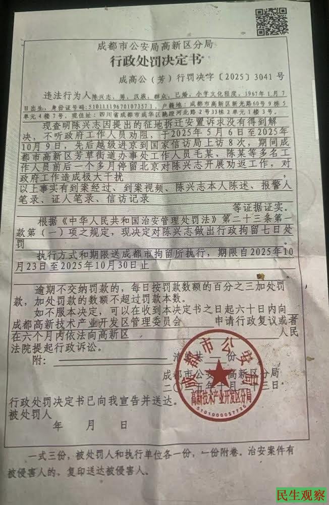 【民生观察2025年10月26日消息】近日,四川成都市高新区被强拆户陈兴志因多次进京上访,被成都市公安局高新区分局给予行政拘留的处罚,现关押在成都市拘留所。