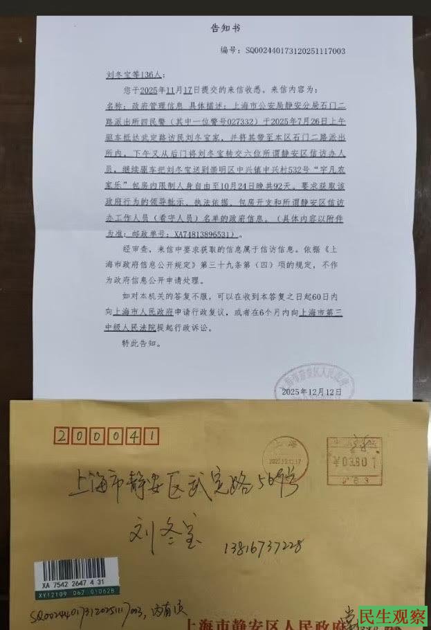 【民生观察2025年12月18日消息】上海静安区石门二路街道的刘冬宝(70岁)在今年阅兵和四中全会前后被关黑监狱90余天,期间遭到暴力殴打,获释后的刘冬宝报案要求警方立案侦查并开具验伤单。之后共有136位访民参与接龙“支持向政府提交信息公开申请”,以帮助刘东宝讨回公道。近日,刘冬宝等136人政府信息公开申请答复称“信访”不作为政府信息公开申请处理。