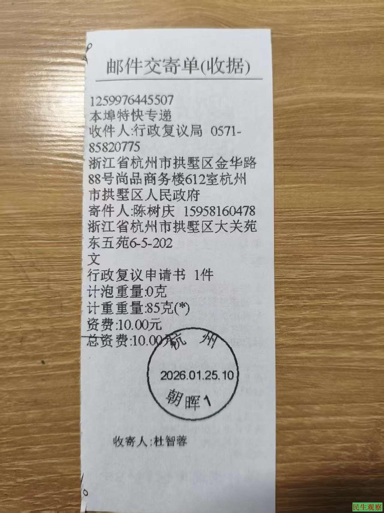 2026年1月25日,申请人陈树庆向杭州市拱墅区人民政府邮寄递交了《行政复议申请书》,请求被申请人杭州市拱墅区社会保险管理服务中心履行法定社会保险责任,按照申请人的《浙江省职工基本养老保险历年参保证明》所表明的累计缴费24年4个月的年限,为申请人办好退休资格确认、核定退休金额并发放退休金。2026年2月3日经拱墅区行政复议局同意,申请人将本行政复议的被申请人变更为杭州市拱墅区人力资源和社会保障局。2026年2月4日,申请人陈树庆收到《行政复议受理通知书》杭拱政复[2026]67号。