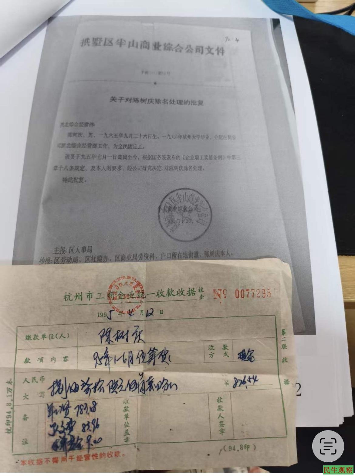 1995年7月拱墅区半山商业综合公司《关于对陈树庆除名处理的批复》,里面所描述“该员于95年7月1日离岗至今”是虚构的、不符合我与该公司约定。实际情况是单位本身经营长期不善(老国有商业单位受大量专业市场、综合市场个体商贩的冲击),早在一年多以前已停发工资,随后我提出承包业务,但因没有提供我为单位创收所需要的条件(看中的营业场地被别人租走),只好约定允许申请人陈树庆自谋生计,人事关系继续挂靠在单位并代为缴纳社保,当然实际费用都由陈树庆自己提供(见申请人前些天家中翻箱倒柜才找出的,在本《申述》的附件:陈树庆向单位支付的代缴社保费用《杭州市工商企业统一收款收据》0077295号为证),这种情况下,当然就不存在所谓的“离岗”还是“在岗”问题了。在通知我“除名”前我没有告知将要除名的理由及维权途径,我当时也只是把它当作单位的单方面解约行为,将“除名”与辞退、辞职之间的实际意思与后果没有去认真了解与分辨。