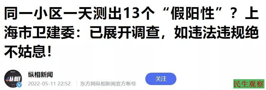 5月11日,东方网纵新闻报道,上海同一个小区同一天测出13个“假阳性”