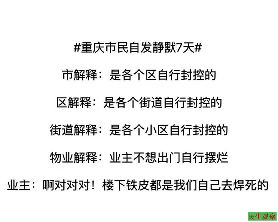重庆市民无奈的在各个网络平台自嘲,自发要求物业和街道上挡板加焊条,自发要求商场和交通不准营业,自发要求大白天天上门捅嗓子做核酸,自发要求学生不去学校,市民自发停工停业。自发要求每户居民每两天可以指定一人出小区购买生活物资。