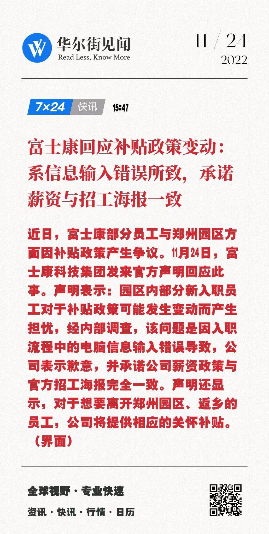 界面新闻:近日,富士康部分员工与郑州园区方面因补贴政策产生争议。11月24日,富士康科技集团向媒体发来声明称,园区内部分新入职员工对于补贴政策可能发生变动而产生担忧,经内部调查,该问题是因入职流程中的电脑信息输入错误导致,公司表示歉意,并承诺公司薪资政策与官方招工海报完全一致。
