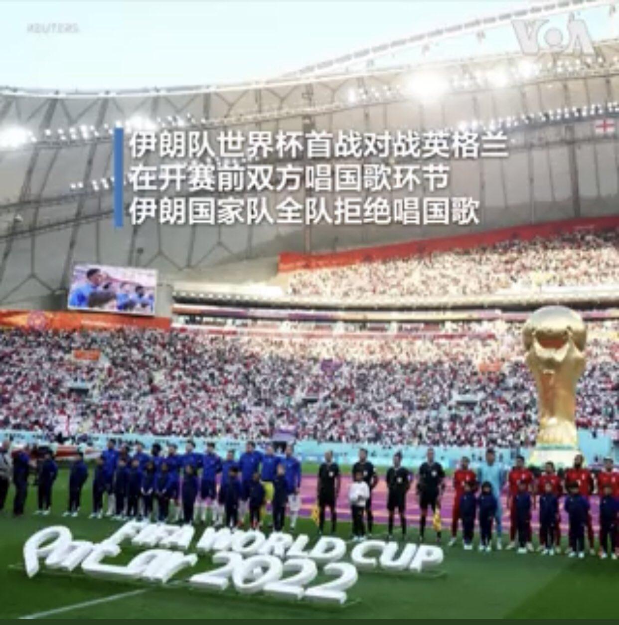 11月21日,在世界杯小组赛B组伊朗对英格兰的比赛开始前,当伊朗国歌在体育场内响起时,11名伊朗球员保持沉默,以拒唱国歌的方式,向伊朗国内的抗议民众表达支持。许多球迷当场热泪盈眶,因为伊朗国家队拒唱国歌,代表他们与数周来为自由而战、反抗政权的伊朗人站在同一边,也有人高举示威的代表性标语“女性、生命、自由”或“自由伊朗”口号的T恤,声援走上街头争取自由、为独立生活而战的伊朗人民。
