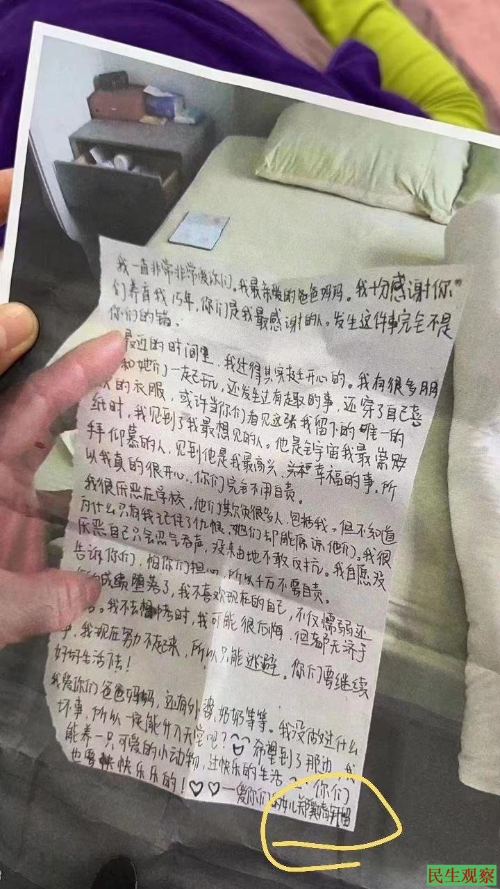 从遗书透露的内容来看,孩子走绝路的原因绝非单一,既有校园霸凌的问题,又有学习压力问题,还有偶像诱导问题,心里健康问题。这么多因素的综合作用下,才让孩子内心彻底崩溃,走上绝路!