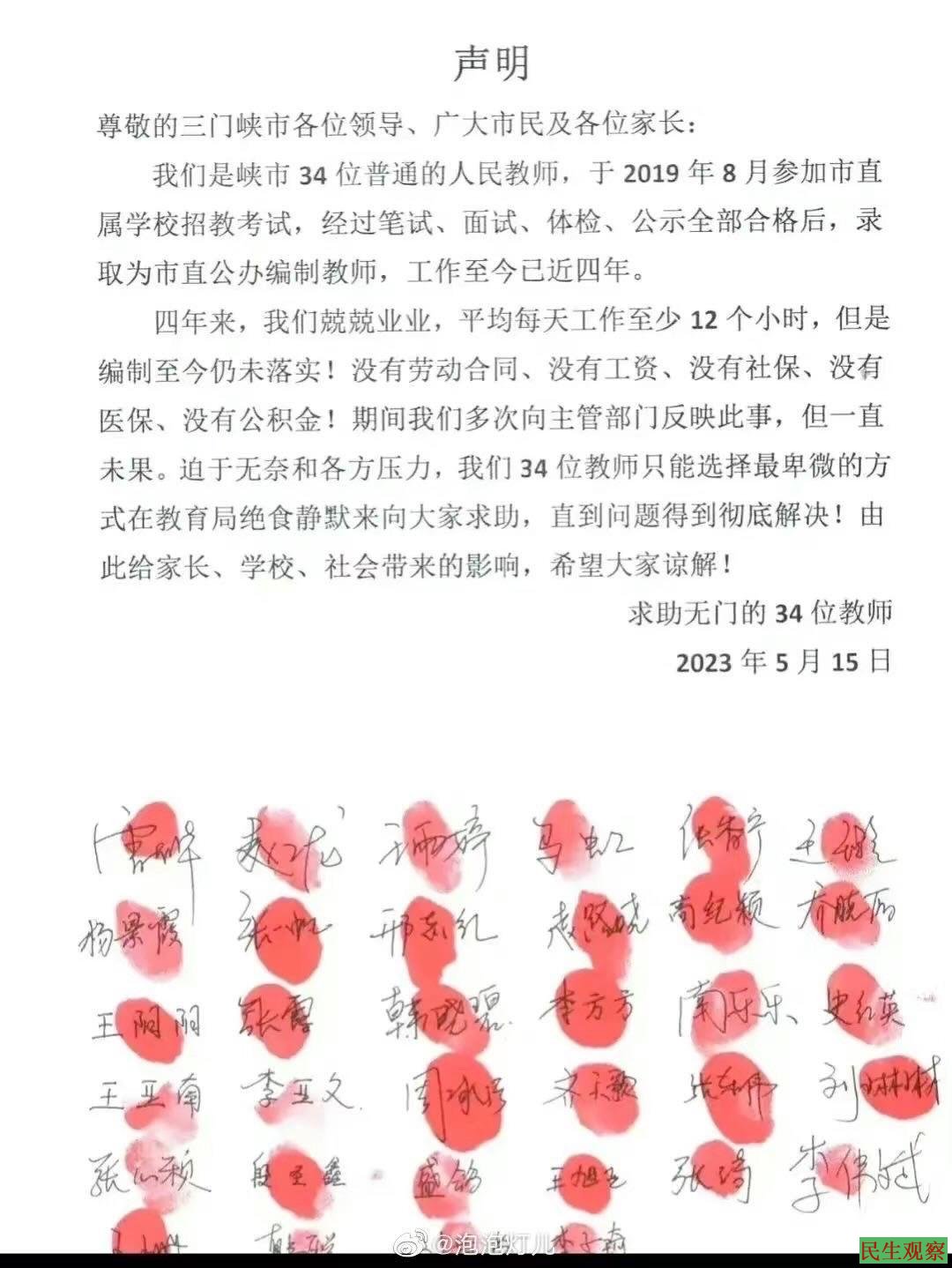 【民生观察2023年5月24日消息】2023年5月15日,河南省三门峡市34名教师宣布绝食抗议。理由是四年来每天高强度工作,但是至今编制没有落实,没有合同没有工资没有社保没有公积金,多次向主管部门反映未果。