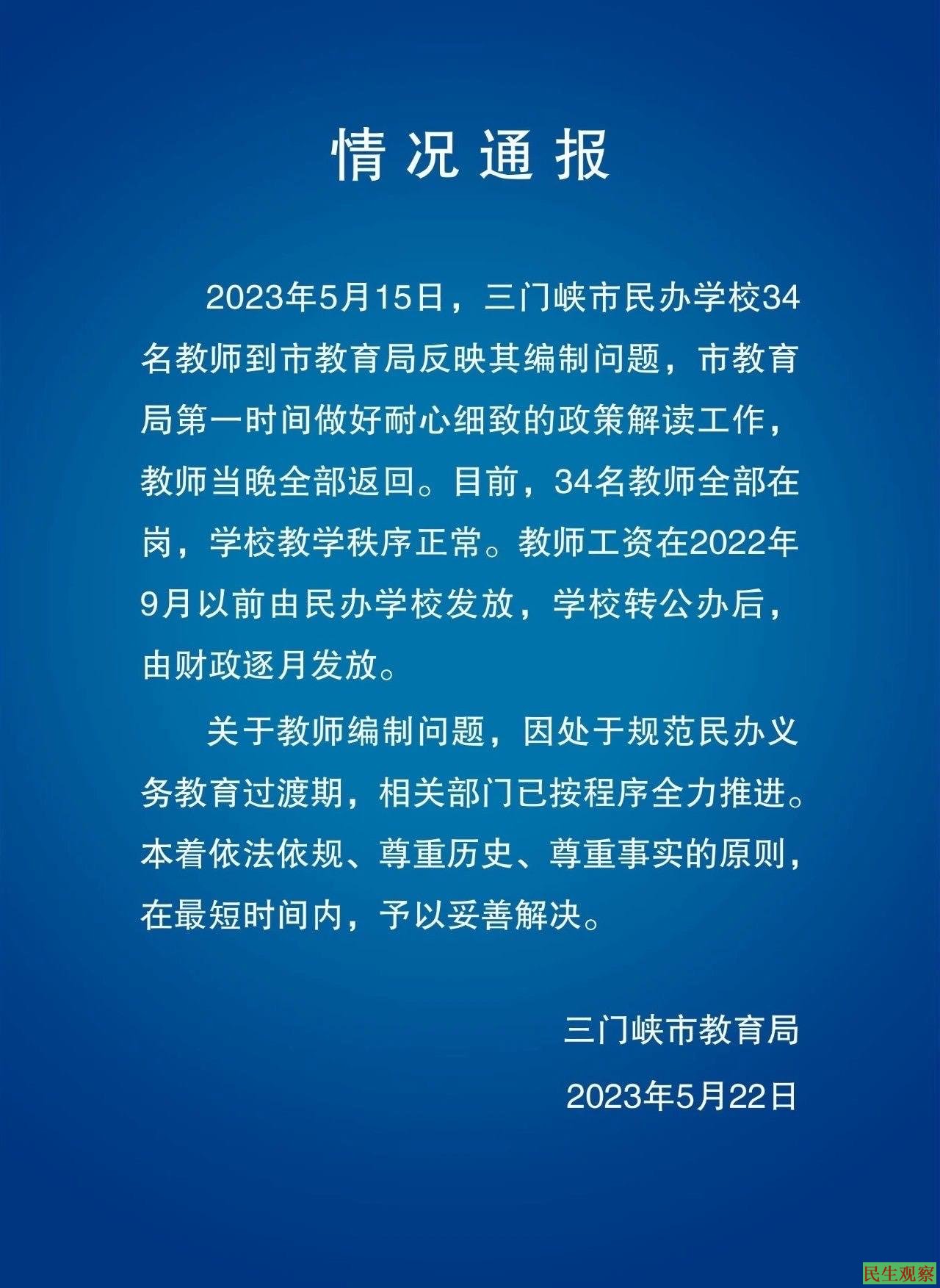 2023年5月22日,三门峡市教育局发布情况通报称:“2023年5月15日,三门峡市民办学校34名教师到市教育局反映其编制问题,市教育局第一时间做好耐心细致的政策解读工作,教师当晚全部返回。目前,34名教师全部在岗,学校教学秩序正常。教师工资在2022年9月以前由民办学校发放,学校转公办后由财政逐月发放。