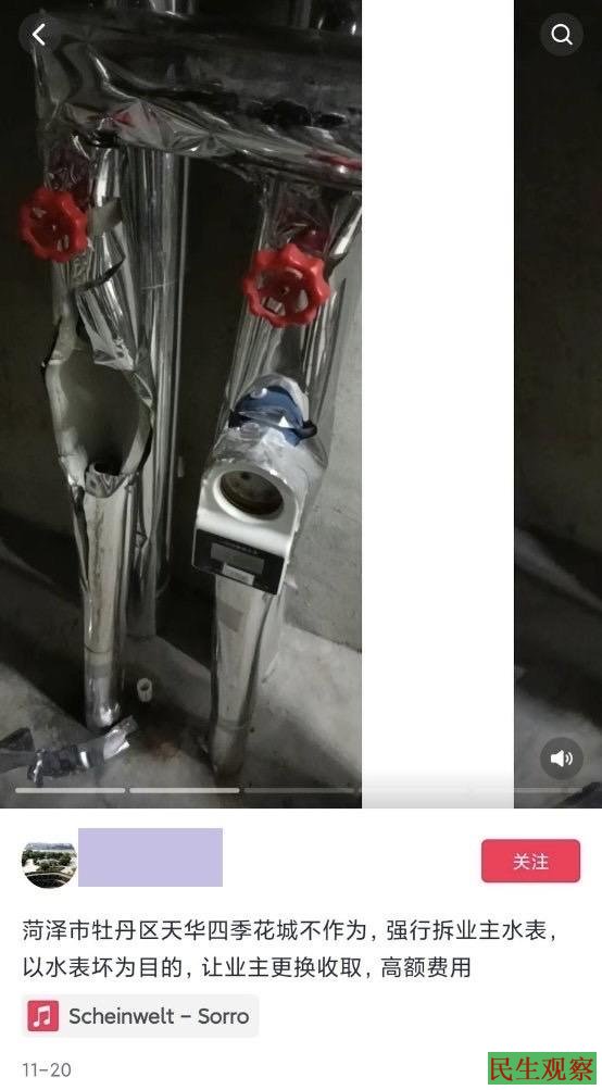 【民生观察2023年12月8日消息】近日,有网友投稿称,山东菏泽农村,强制换高价智能插卡水表,不换就强制砸坏水表停水。笔者随后在网上搜了一下,发现这种问题全国各地都有,且存在了很长一段时间。