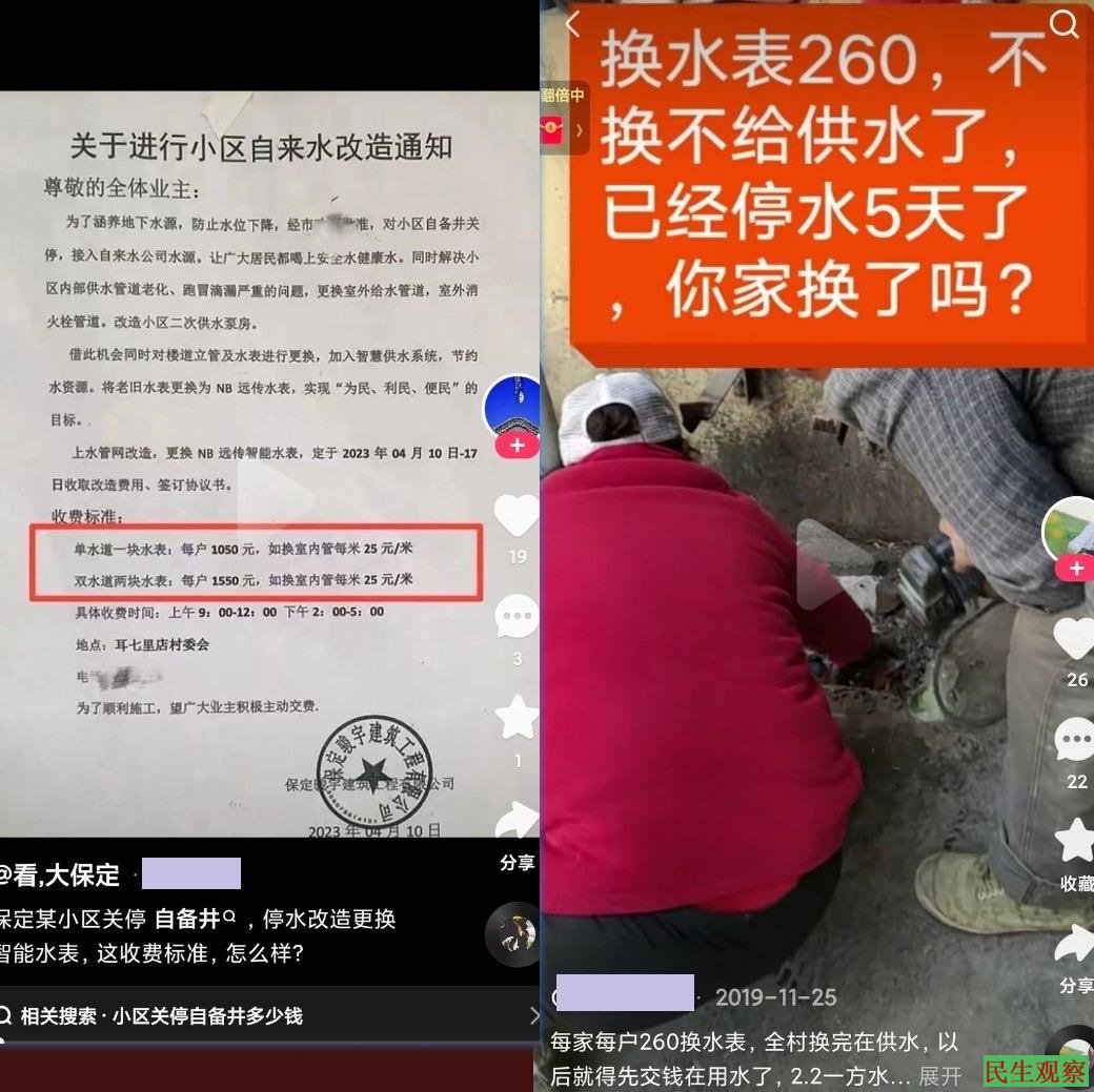 随后,有河北网友爆出,保定也于今年4月份更换单块水表每户收费1050元,双水道两表为1550元。