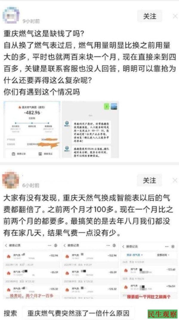 在知乎,《川渝多地被指换新表后燃气费异常》专题吸引了6600多条讨论,1100多万浏览量。其中《如何看待重庆燃气第四季度利润暴增倍,调查组进驻倒查3年》的问题就有1200多条回答,显示民众对国企垄断下民生日艰的关切。